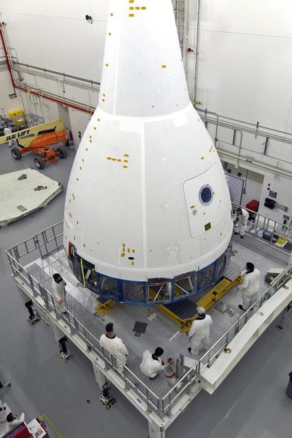 Inside the Launch Abort System Facility (LASF) at NASA’s Kennedy Space Center in Florida, workers are completing the integration of a test version of the Orion crew module with the Launch Abort System (LAS) on May 18, 2019. The test vehicle and the LAS will be used for the Orion Ascent Abort-2 (AA-2) Flight Test. AA-2 is a full-stress test of the LAS, planned for July 2. AA-2 will launch from Space Launch Complex 46, carrying a fully functional LAS and a 22,000-pound Orion test vehicle to an altitude of 31,000 feet and traveling at more than 1,000 miles an hour. The test will verify the LAS can steer the crew module and astronauts aboard to safety if an emergency occurs during ascent on the Space Launch System (SLS) rocket. NASA's Orion and Exploration Ground Systems programs, contractors Jacob's, Lockheed Martin and Northrop Grumman, in conjunction with the Air Force Space and Missile Center's Launch Operations branch and the 45th Space Wing are performing flight operations for AA-2.