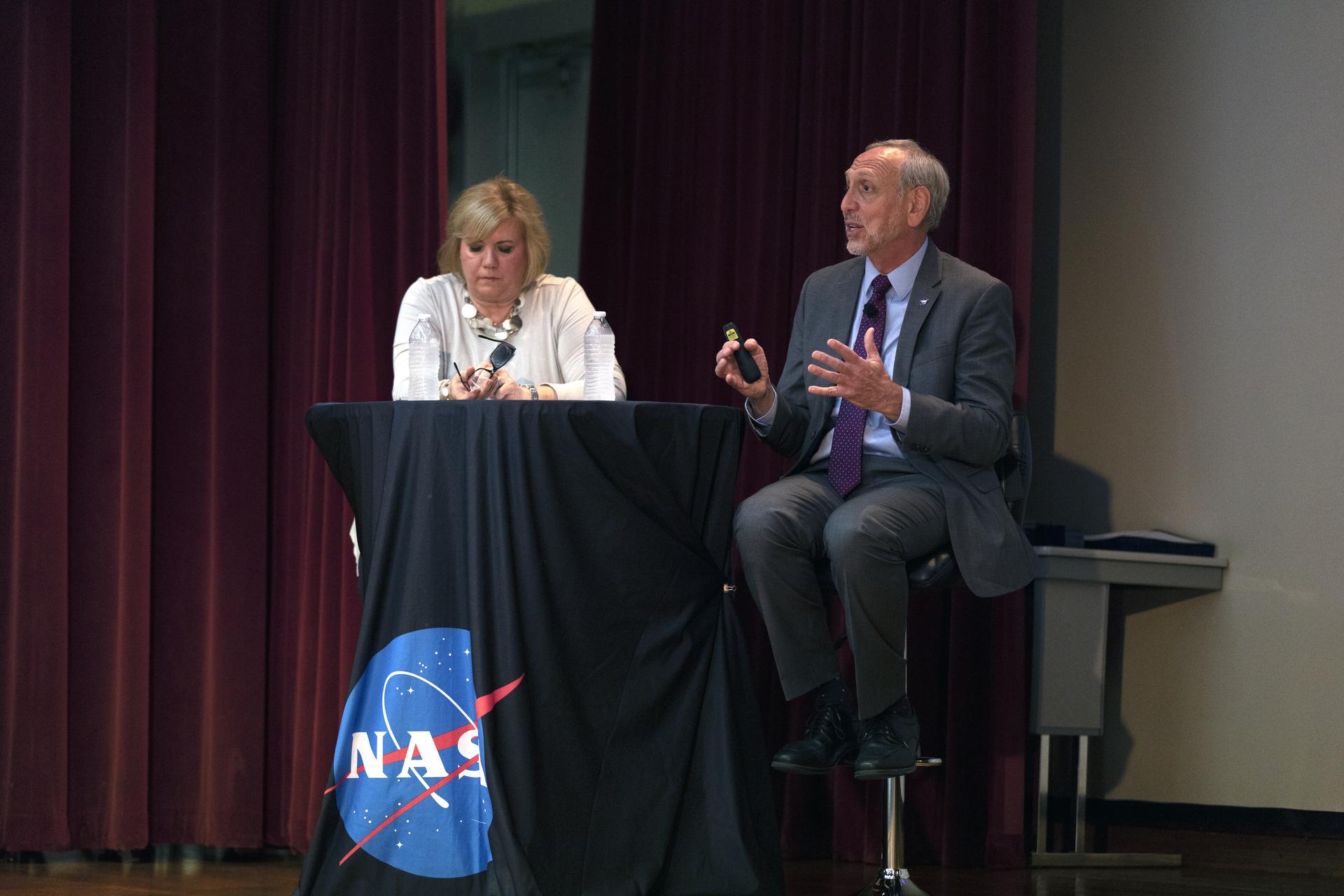 NASA’s Deputy Associate Administrator Melanie Saunders, left, and Associate Administrator Steve Jurczyk participate in a Town Hall session at Kennedy Space Center on May 28, 2019. The agency senior leaders provided an update on the agency’s Exploration campaign, current missions and NASA’s operating model initiatives. As part of its Artemis program, NASA is charged with landing the first American woman and next American man at the South Pole of the Moon by 2024.