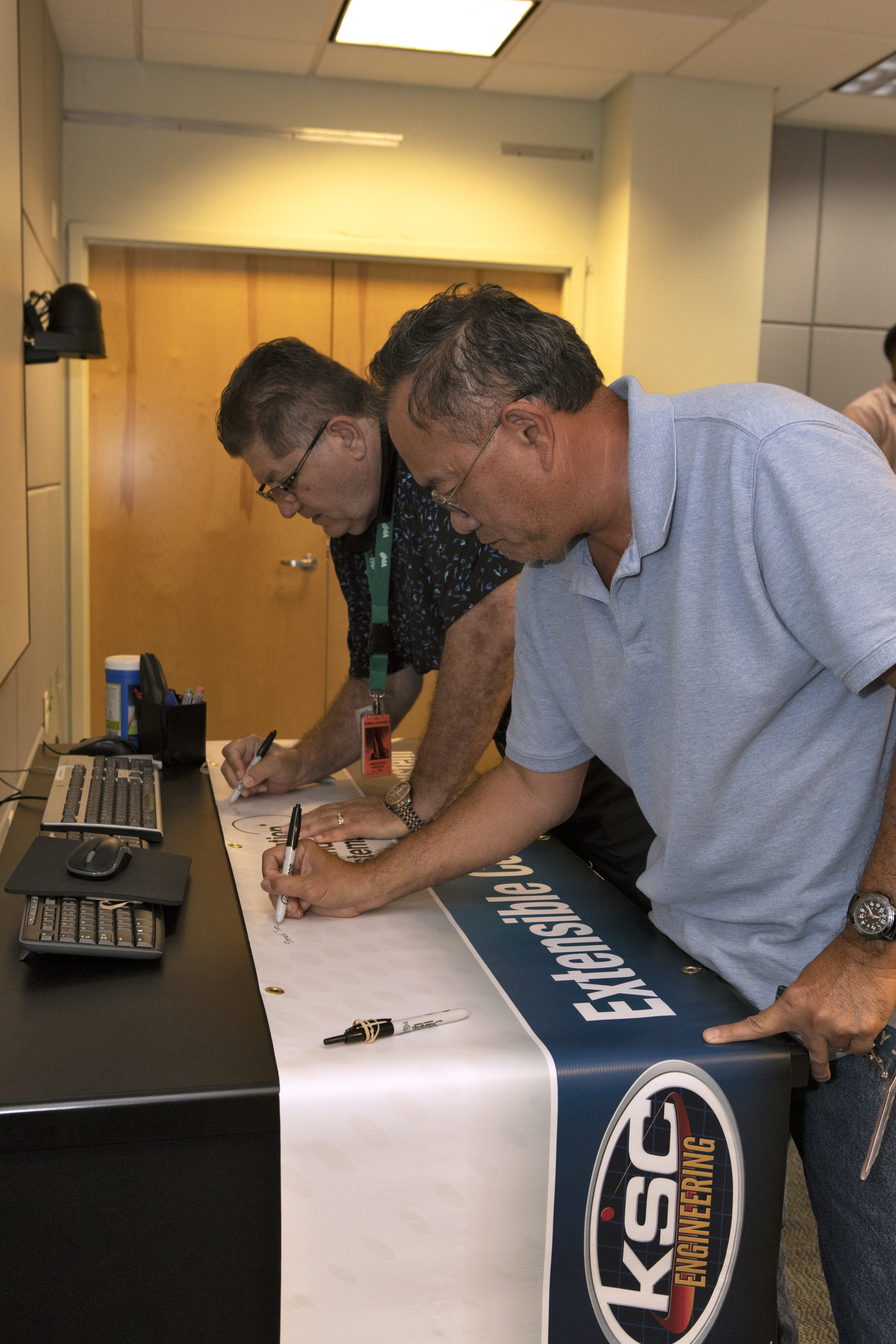 Engineers celebrate the completion of the Extensible Column Subsystem (XCS) project during a banner event held in Operations Support Building II at Kennedy Space Center. The XCS team successfully executed an aggressive schedule, receiving outstanding support from the fabrication contractor, Met-Con. Full functional testing occurred at Met-Con’s facility, with no mechanical or structural issues. All four columns and the test fixture have been delivered to Kennedy. Full-scale testing will take place when the Mobile Launcher gets to the pad later this summer.