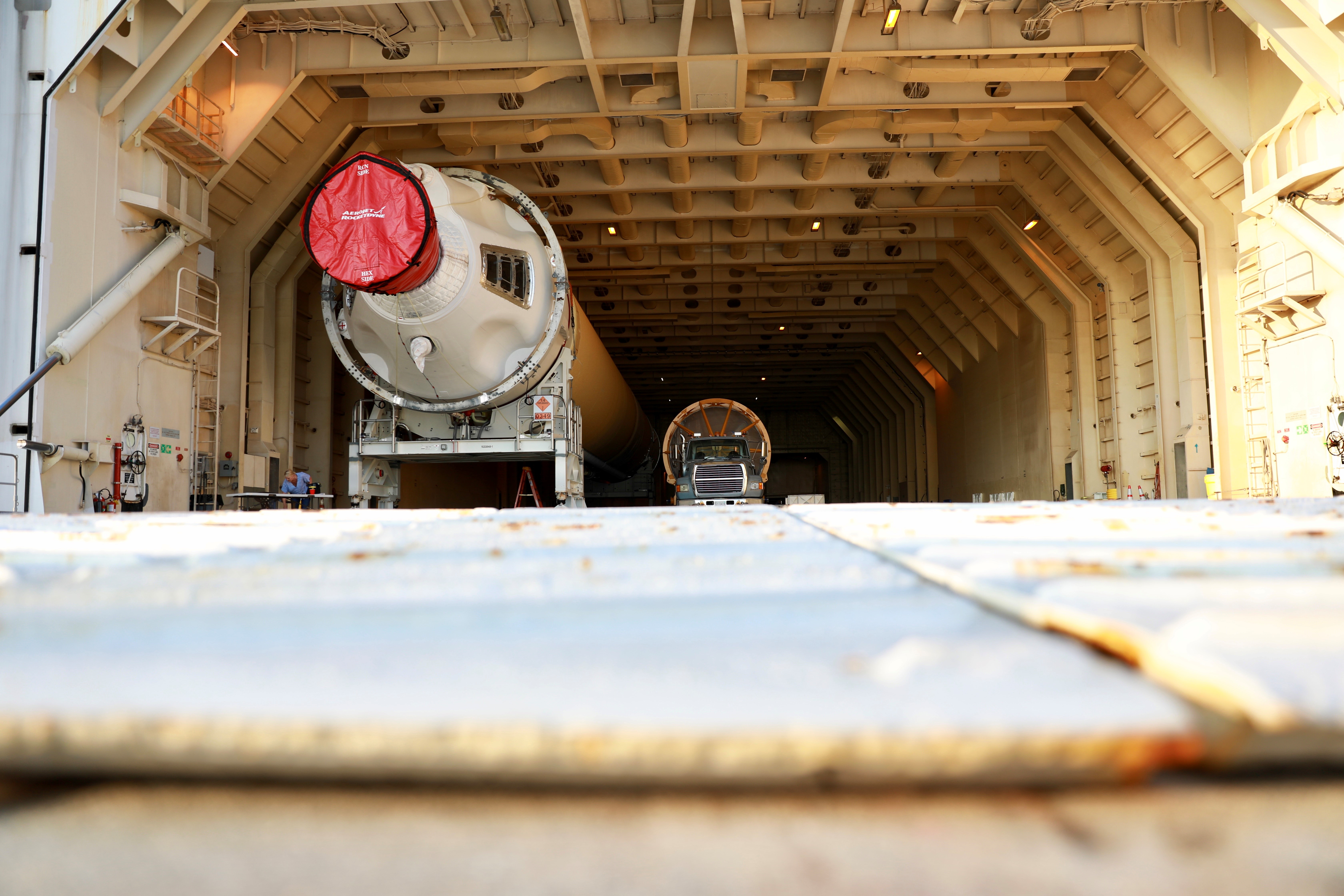 At the Army Wharf at Cape Canaveral Air Force Station in Florida, the United Launch Alliance (ULA) Mariner cargo ship door is lowered on June 5, 2019, for offloading of the ULA Atlas V booster that will be used for Boeing’s Crew Flight Test (CFT). The Atlas V rocket will launch the CST-100 Starliner spacecraft and its crew, NASA astronauts Mike Fincke and Nicole Mann and Boeing astronaut Chris Ferguson, to the International Space Station for NASA’s Commercial Crew Program. The booster will be transported to the Atlas Spaceflight Operations Center to await the start of operations for its mission. The CFT will demonstrate Starliner and Atlas V’s ability to safely carry crew to and from the orbiting laboratory.