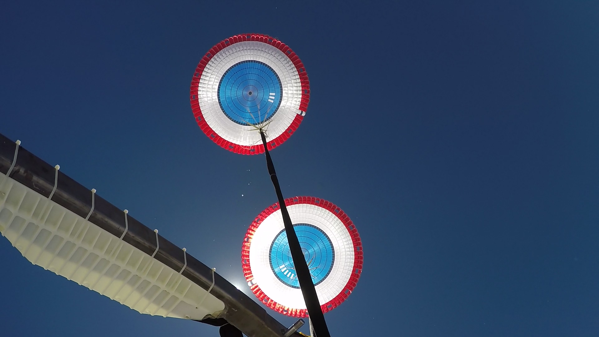 In this view looking up, Boeing’s CST-100 Starliner’s parachutes deploy above the U.S. Army’s White Sands Missile Range in New Mexico during parachute system testing on June 24, 2019. Boeing conducted the test using a full-scale Starliner test article, known as a boiler plate, designed to simulate the actual spacecraft. The test involved intentionally disabling one of the parachute system’s two drogue parachutes and one of the three main parachutes to evaluate how the remaining parachutes handled the additional loads during deployment and descent. This was one of a series of important parachute tests to validate the system is safe to carry astronauts to and from the International Space Station as part of NASA’s Commercial Crew Program. Boeing is targeting an uncrewed Orbital Flight Test to the space station this summer, followed by its Crew Flight Test. Starliner will launch atop a United Launch Alliance Atlas V rocket from Space Launch Complex 41 at Cape Canaveral Air Force Station in Florida.
