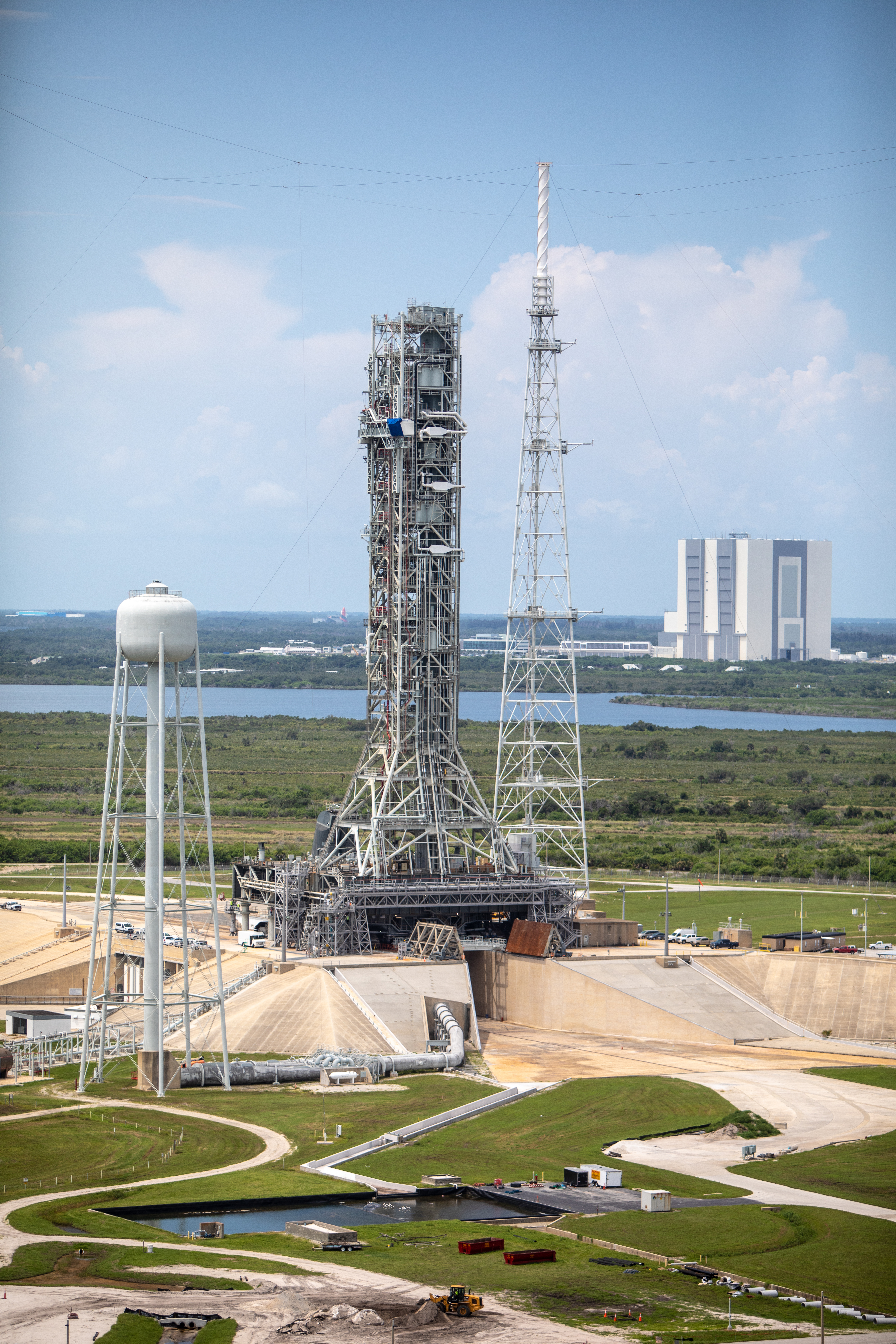 A close-up aerial view of Launch Complex 39B with Exploration Ground Systems’ mobile launcher for the Artemis 1 mission on the pad. The mobile launcher, atop crawler-transporter 2, made its final solo trek from the Vehicle Assembly Building on June 27, 2019, and arrived on the surface of pad B on June 28, 2019, at NASA’s Kennedy Space Center in Florida. The mobile launcher will remain at the pad over the summer, undergoing final testing and checkouts. Its next roll to the pad will be with the agency’s Space Launch System rocket and Orion spacecraft in preparation for the launch of Artemis 1.