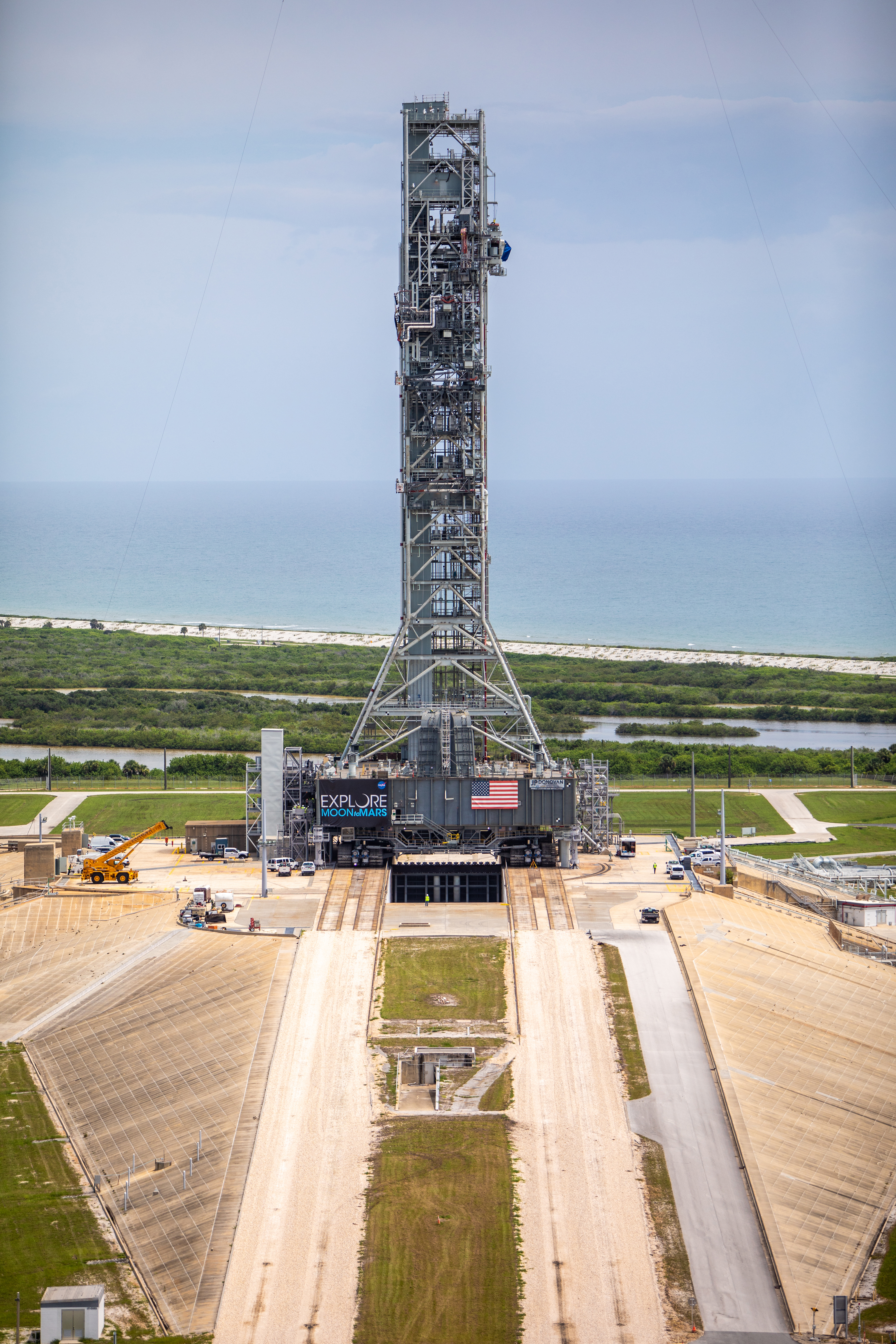 A close-up aerial view of Launch Complex 39B with Exploration Ground Systems’ mobile launcher for the Artemis 1 mission on the pad. The mobile launcher, atop crawler-transporter 2, made its final solo trek from the Vehicle Assembly Building on June 27, 2019, and arrived on the surface of pad B on June 28, 2019, at NASA’s Kennedy Space Center in Florida. The mobile launcher will remain at the pad over the summer, undergoing final testing and checkouts. Its next roll to the pad will be with the agency’s Space Launch System rocket and Orion spacecraft in preparation for the launch of Artemis 1.