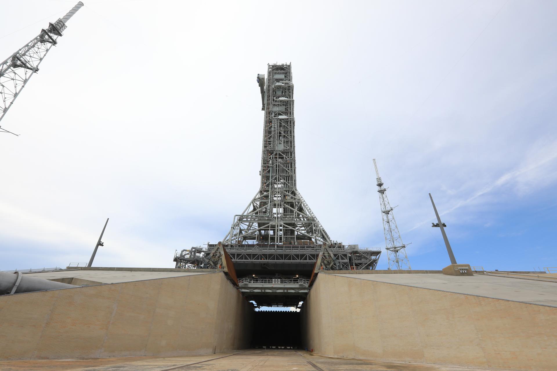 In this view from the flame trench at Kennedy Space Center’s Launch Complex 39B in Florida, Exploration Ground Systems’ mobile launcher can be seen on the pad surface on June 28, 2019. The mobile launcher began its final solo trek – atop crawler-transporter 2 – to the pad at midnight on June 27, departing from NASA’s Vehicle Assembly Building and continuing up to the pad surface on June 28. The mobile launcher will remain at the pad over the summer, undergoing final testing and checkouts. Its next roll to the pad will be with the agency’s Space Launch System rocket and Orion in preparation for the launch of Artemis 1.