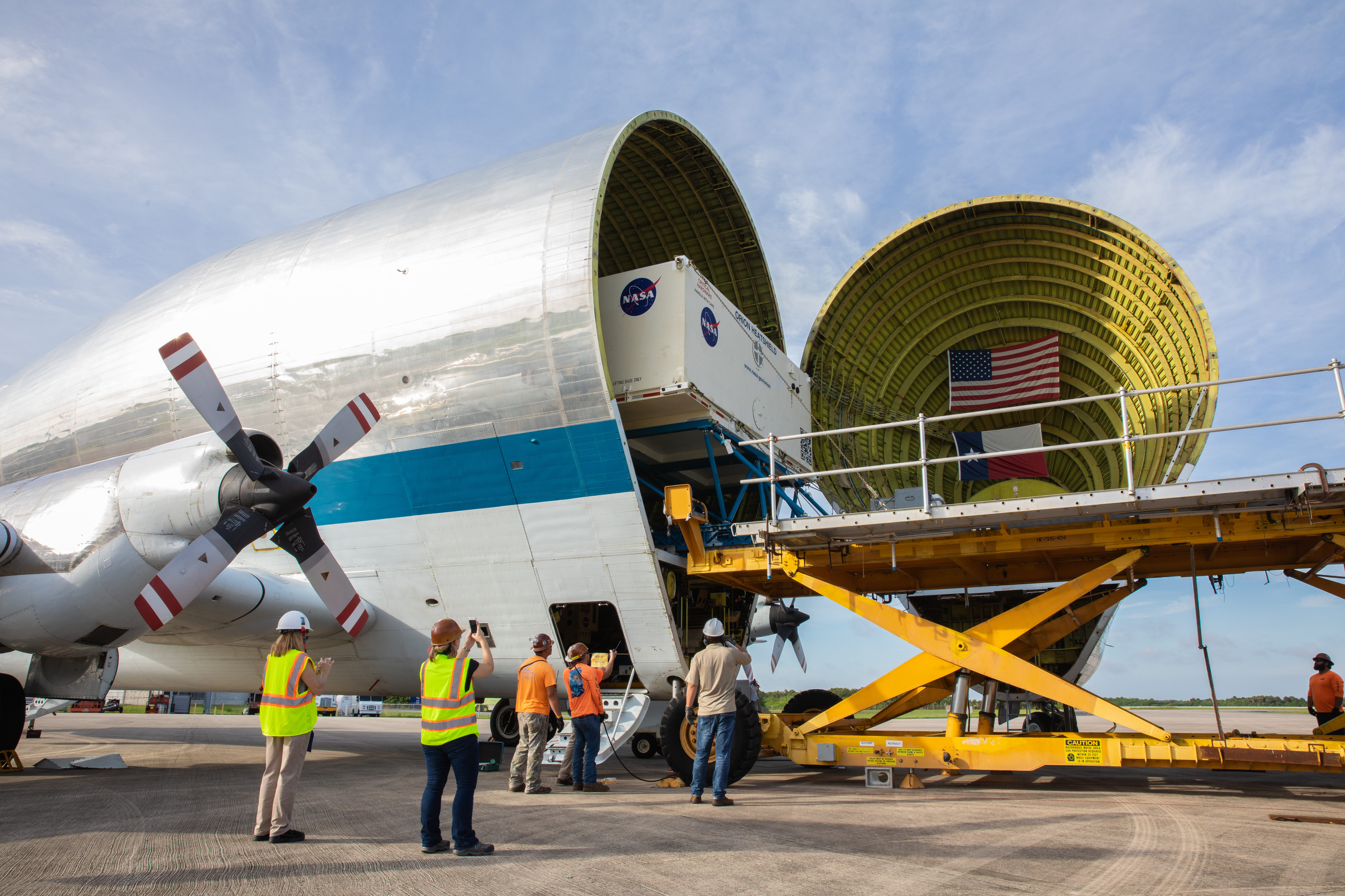 Preparations are underway to unload the heat shield for Orion’s Artemis 2 mission, NASA’s first crewed mission, in its shipping container from NASA’s Super Guppy aircraft at the agency’s Kennedy Space Center Shuttle Landing Facility in Florida on July 9, 2019. The heat shield, measuring roughly 16 feet in diameter, will protect astronauts upon re-entry on the second mission of Artemis. The heat shield arrived from Lockheed Martin’s manufacturing facility near Denver. It will be delivered to the Neil Armstrong Operations and Checkout facility high bay. The heat shield is a base titanium truss structure. Over the next several months, technicians will apply Avcoat, an ablative material that will provide the thermal protection. Artemis 2 will confirm all of the spacecraft’s systems operate as designed in the actual environment of deep space with astronauts aboard.