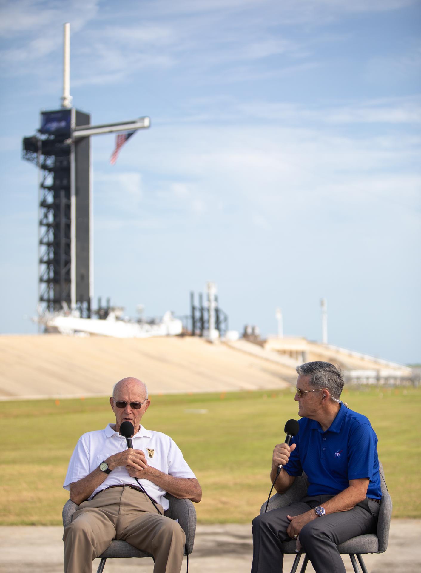 On July 16, 2019, the 50th anniversary of the Apollo 11 launch, astronaut Michael Collins, left, speaks to Kennedy Space Center Director Bob Cabana at Launch Complex 39A. During his visit to the Florida spaceport, Collins discussed the moments leading up to launch at 9:32 a.m. on July 16, 1969, and what it was like to be part of the first crew to land on the Moon.