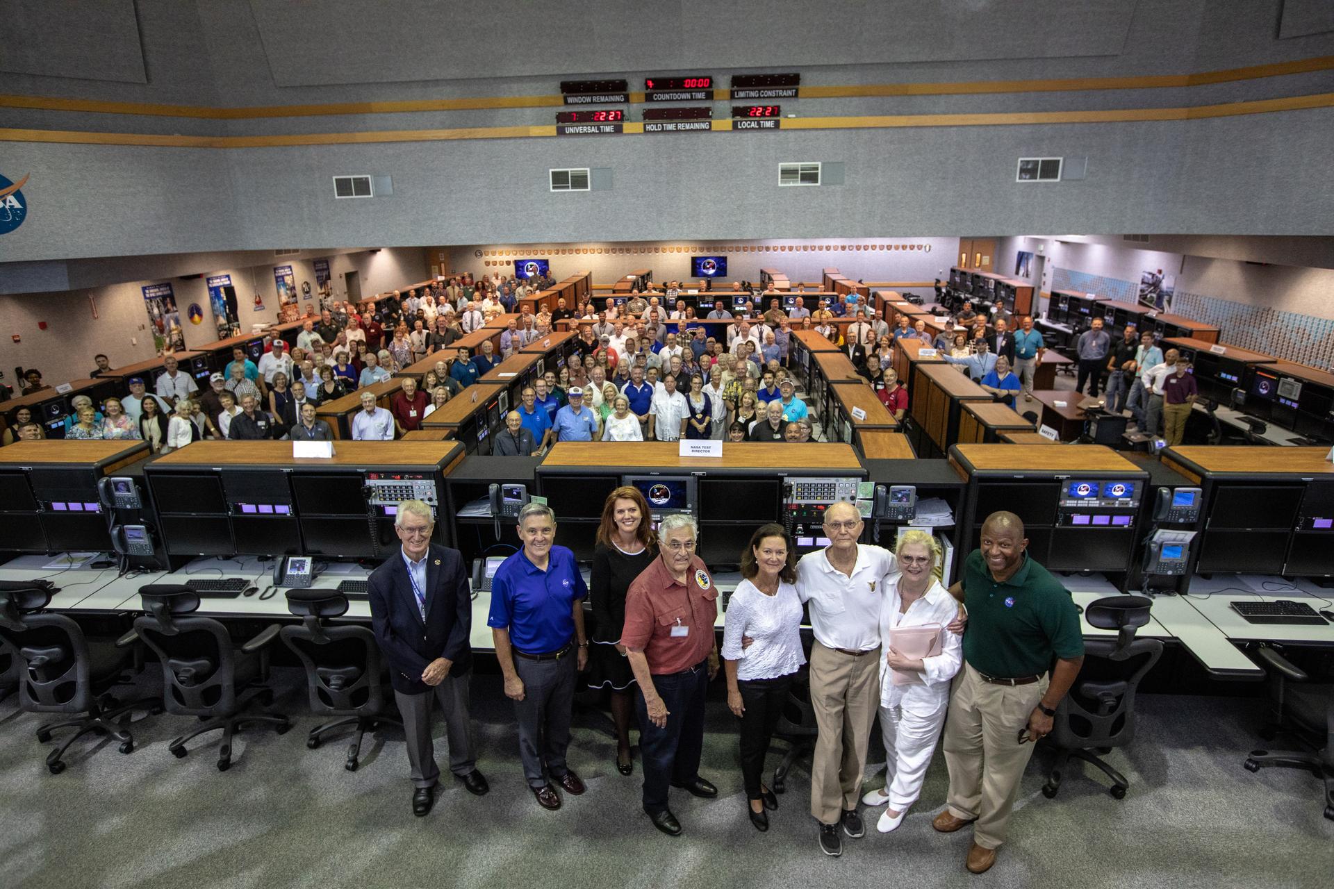 On July 16, 2019, the 50th anniversary of the Apollo 11 launch to the Moon, launch team members from Apollo 11 and Artemis 1 mingled in Launch Control Center Firing Room 1 at NASA's Kennedy Space Center in Florida. From left, are John Tribe, Apollo 11 launch team member; Kennedy Space Center Director Bob Cabana; Artemis 1 Launch Director Charlie Blackwell-Thompson; Harrison Schmitt, Apollo 17 astronaut; Apollo 11 astronaut Michael Collins, with his daughters Ann (left) and Kate (right); and Kelvin Manning, associate director, technical.