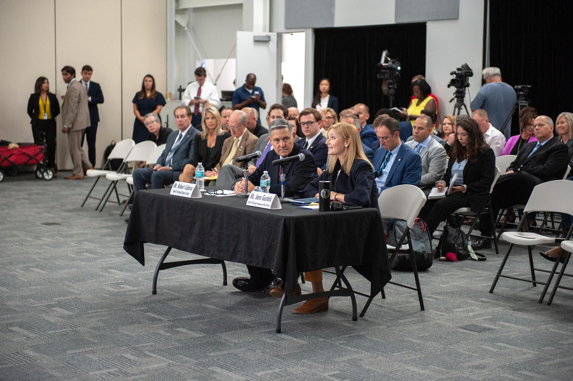 Bob Cabana, director of NASA’s Kennedy Space Center in Florida, and Jenn Gustetic, program executive, NASA Small Business Innovation Research Program (SBIR), speak to Florida legislators participating in the U.S. Senate Committee on Small Business and Entrepreneurship field hearing on July 19, 2019, in the Astronaut Memorial Foundation facility at Kennedy’s Visitor Complex. The topic of the field hearing was “Moon Landings to Mars Exploration: The Role of Small Business Innovation in America’s Space Program.”