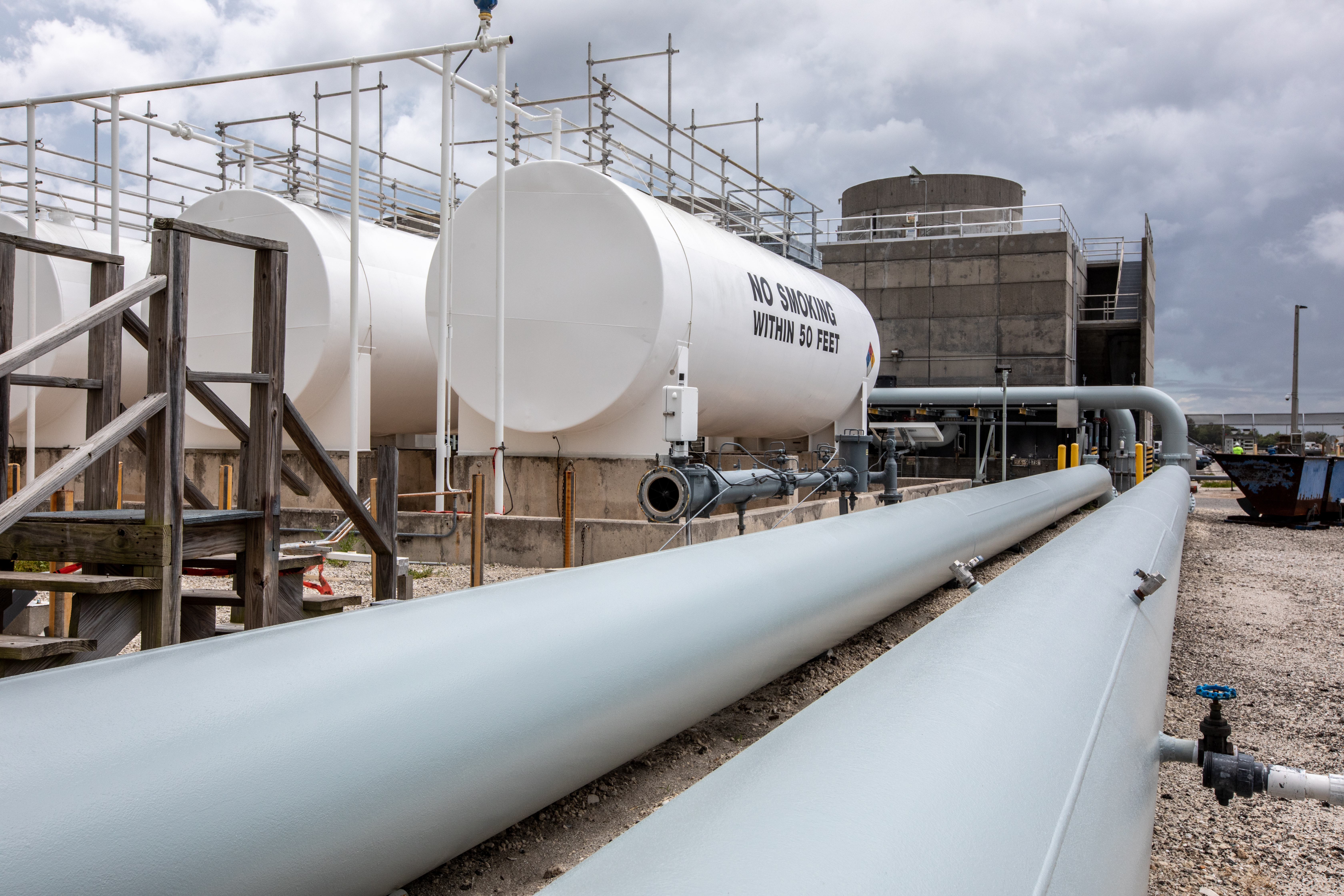 A photograph taken July 24, 2019, shows new tanks and piping were installed outside of the Utility Annex near the Vehicle Assembly (VAB) Building at NASA’s Kennedy Space Center in Florida. The Utility Annex, which provides 8,000 gallons of chilled water per minute to the VAB and other facilities in the Launch Complex 39 area, is being upgraded and repaired. The facility also contains boilers necessary to provide hot water to the VAB. The center’s Engineering Directorate is making the repairs and upgrades to the facility to prepare for the agency’s Artemis missions to the Moon and on to Mars.