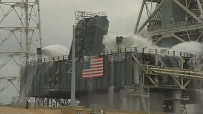The second set of 4 Ignition Overpressure and Sound Suppression Systems (IOPSS) wet flow tests at Pad B to certify the Pad and Mobile Launcher for launch operations.