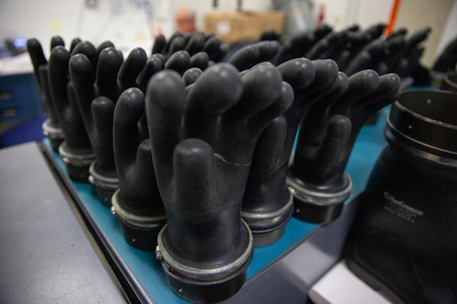 Inside the Multi-Operations Support Building near the Multi-Payload Processing Facility (MPPF) at NASA’s Kennedy Space Center in Florida on Aug. 16, 2019, rows of gloves that are part of Self-Contained Atmospheric Protective Ensemble (SCAPE) suits are in view inside a changing room. SCAPE technicians will practice putting on SCAPE suits for a test simulation of loading propellants into a replicated test tank for Orion. Exploration Ground Systems is preparing for Artemis 1 with a series of hazardous hyper test events at the MPPF. After donning their suits, the technicians will complete a tanking to test the system before Orion arrives for processing. During preparations for launch, these teams will be responsible for loading the Orion vehicle with propellants prior to transportation to the Vehicle Assembly Building, where it will be secured atop the Space Launch System rocket. SCAPE suits are used in operations involving toxic propellants and are supplied with air either through a hardline or through a self-contained environmental control unit.