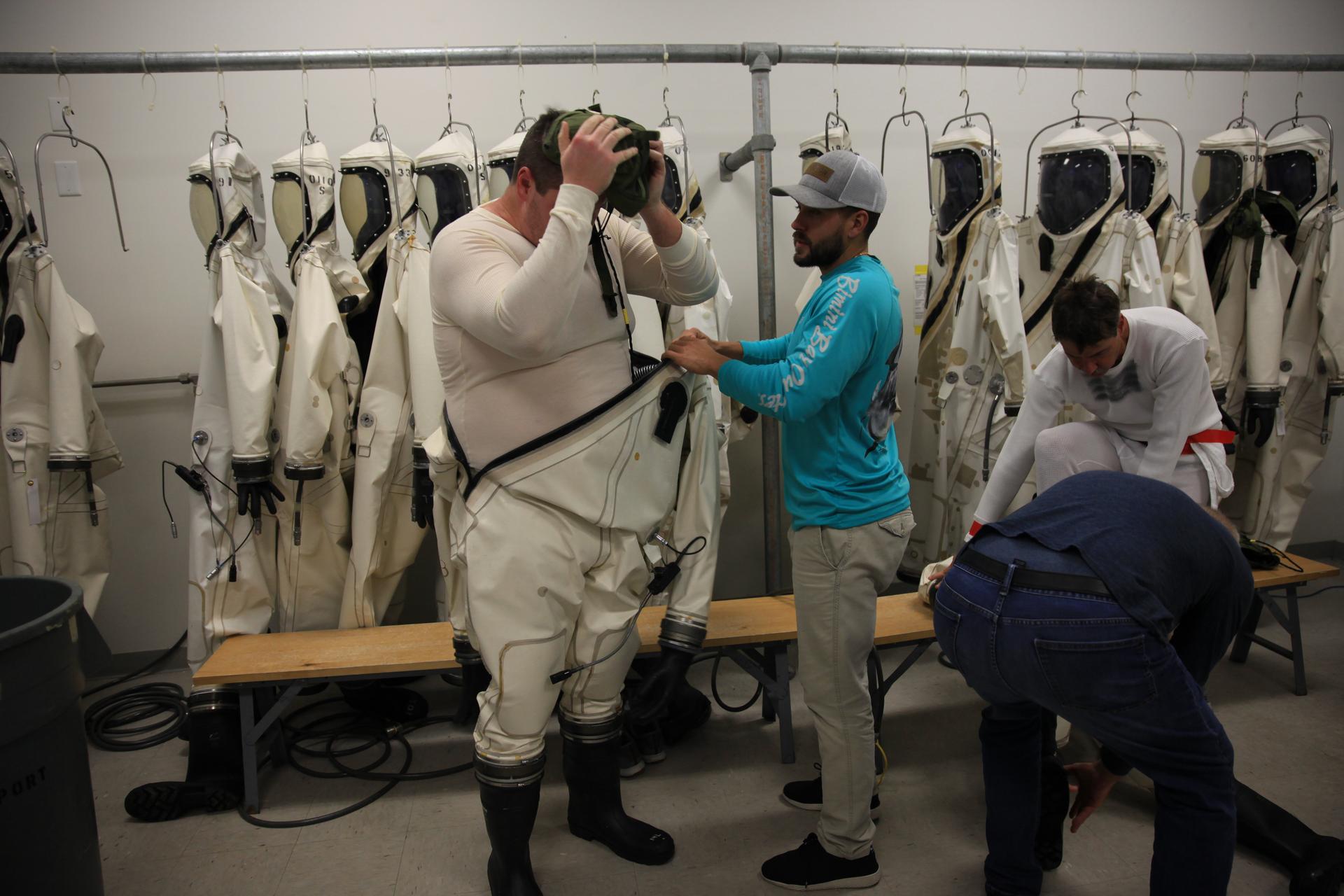 Inside the Multi-Operations Support Building near the Multi-Payload Processing Facility (MPPF) at NASA’s Kennedy Space Center in Florida, technicians put on Self-Contained Atmospheric Protective Ensemble (SCAPE) suits inside a changing room on Aug. 16, 2019. SCAPE technicians are practicing by putting on the suits for a test simulation of loading propellants into a replicated test tank for Orion. Exploration Ground Systems is preparing for Artemis 1 with a series of hazardous hyper test events at the MPPF. After donning their suits, the technicians will complete a tanking to test the system before Orion arrives for processing. During preparations for launch, these teams will be responsible for loading the Orion vehicle with propellants prior to transportation to the Vehicle Assembly Building, where it will be secured atop the Space Launch System rocket. SCAPE suits are used in operations involving toxic propellants and are supplied with air either through a hardline or through a self-contained environmental control unit.