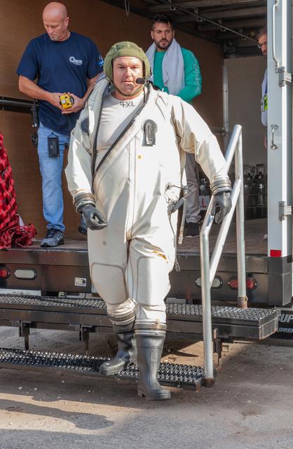 A technician in a Self-Contained Atmospheric Protective Ensemble (SCAPE) suit exits a truck near the Multi-Payload Processing Facility (MPPF) at NASA’s Kennedy Space Center in Florida on Aug. 16, 2019. SCAPE technicians are practicing by putting on the suits for a test simulation of loading propellants into a replicated test tank for Orion. Exploration Ground Systems is preparing for Artemis 1 with a series of hazardous hyper test events at the MPPF. After donning their suits, the technicians will complete a tanking to test the system before Orion arrives for processing. During preparations for launch, these teams will be responsible for loading the Orion vehicle with propellants prior to transportation to the Vehicle Assembly Building, where it will be secured atop the Space Launch System rocket. SCAPE suits are used in operations involving toxic propellants and are supplied with air either through a hardline or through a self-contained environmental control unit.