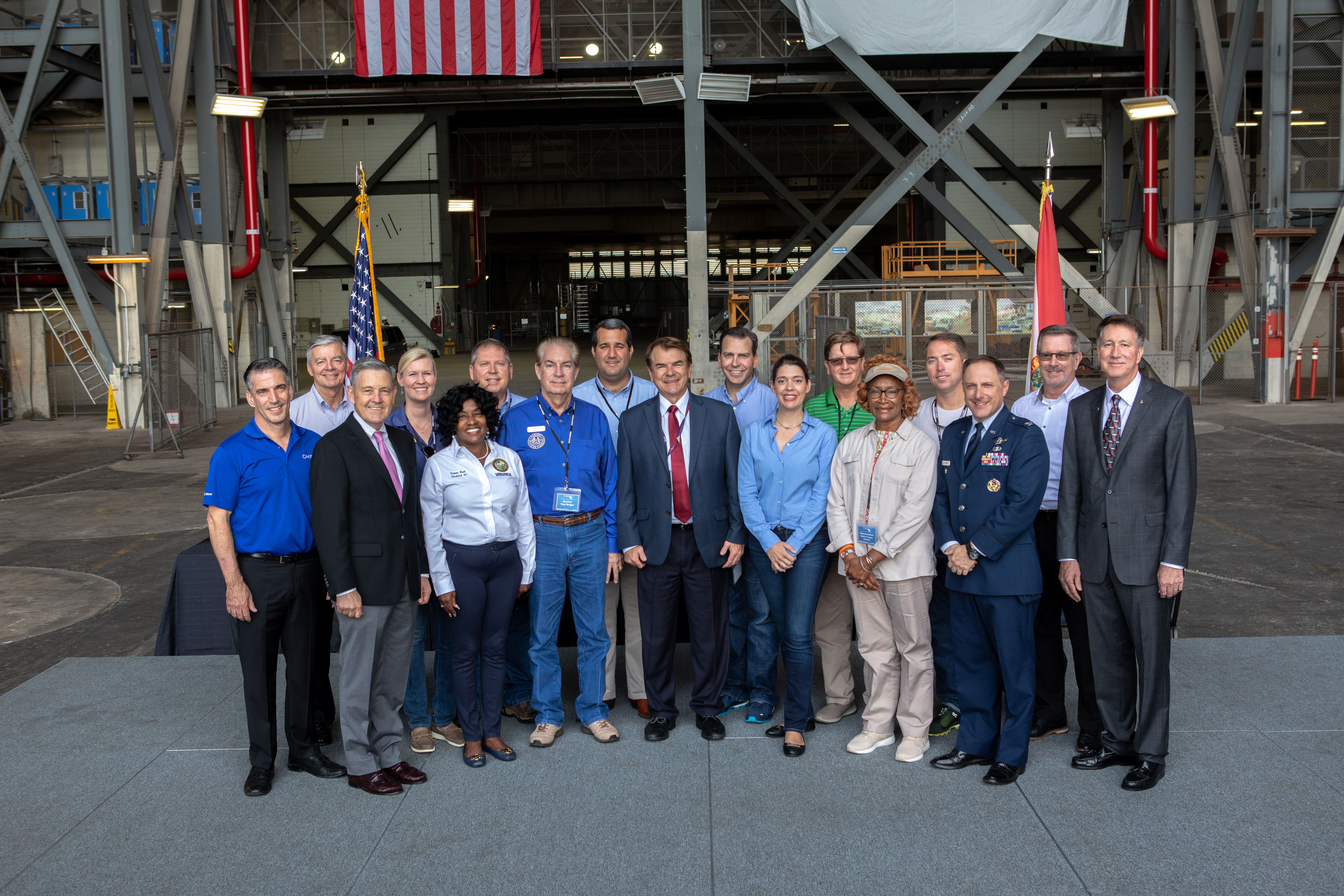 A ribbon cutting ceremony took place on Aug. 16, 2019, in High Bay 2 of the Vehicle Assembly Building (VAB) at NASA’s Kennedy Space Center in Florida. Attendees included legislators and invited guests. In the center is Florida State Senator Thad Altman. In the front row, far left, is Kennedy Center Director Bob Cabana. In the front row, far right, is Col. Thomas Ste. Marie, vice commander, U.S. Air Force, 45th Space Wing. In the back row, far right, is Kent Rominger, Northrop Grumman’s vice president and capture lead for the OmegA launch system. The VAB is getting its first commercial tenant. Northrop Grumman signed a Reimbursable Space Act Agreement with NASA for use of the facilities. The company will assemble and test its new OmegA rocket inside the massive facility’s High Bay 2. The company also will modify mobile launcher platform-3 to serve as the launch vehicle’s assembly and launch platform. Northrop Grumman is developing the OmegA rocket, an intermediate/heavy-class launch vehicle, as part of a launch services agreement with the U.S. Air Force.