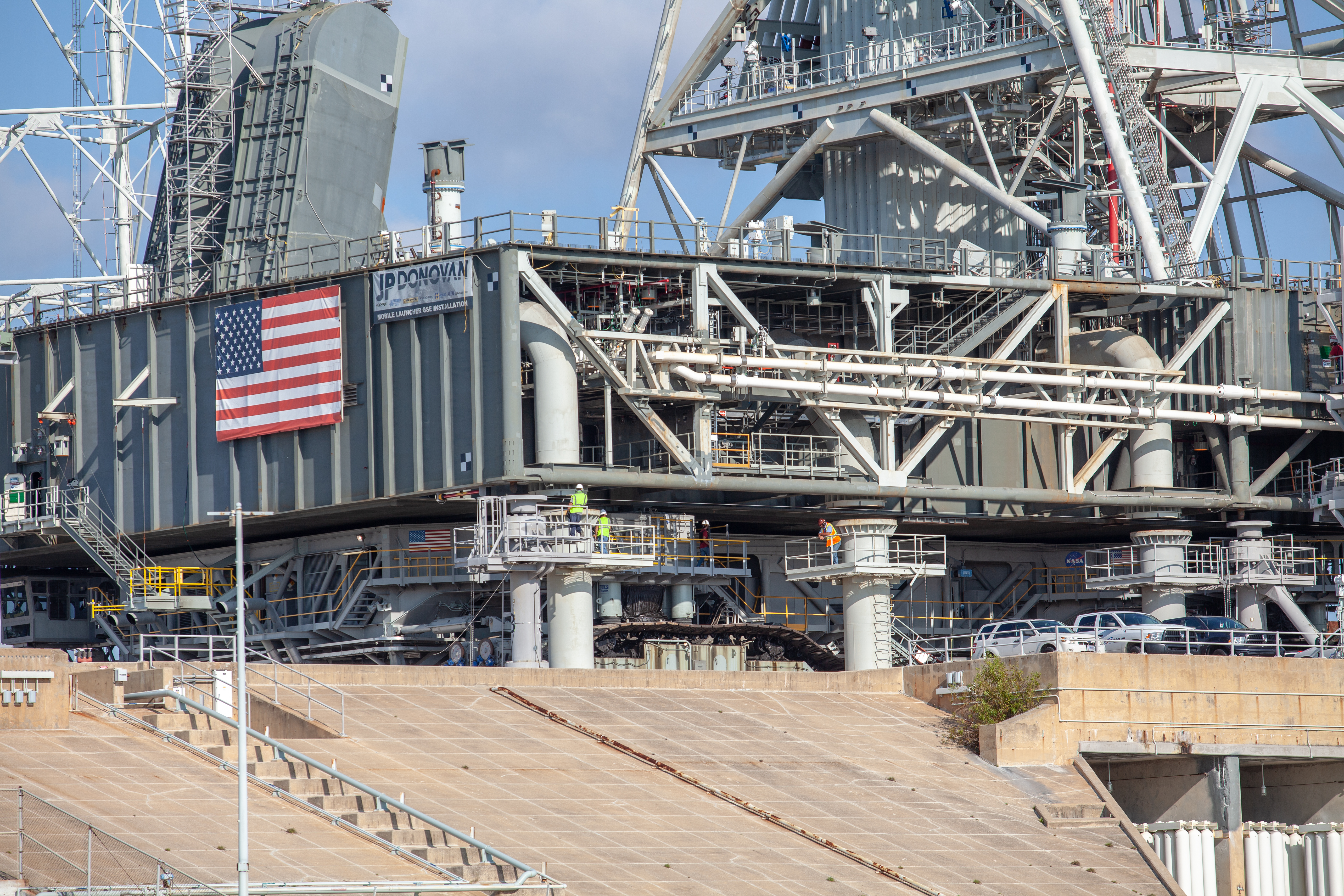 The mobile launcher for Artemis missions is at Launch Pad 39B on Sept. 11, 2019, at NASA’s Kennedy Space Center in Florida, after spending a week and a half inside the Vehicle Assembly Building (VAB) due to the approach of Hurricane Dorian. The nearly 400-foot-tall structure was moved from Launch Pad 39B to the VAB for safekeeping on Aug. 30. The storm passed about 70 miles east of the spaceport during the overnight hours Tuesday, Sept. 3, and Wednesday, Sept. 4. NASA’s Exploration Ground Systems moved the mobile launcher back to the launch pad, where teams will complete testing and checkout on the launcher in the coming weeks for the Artemis I mission.