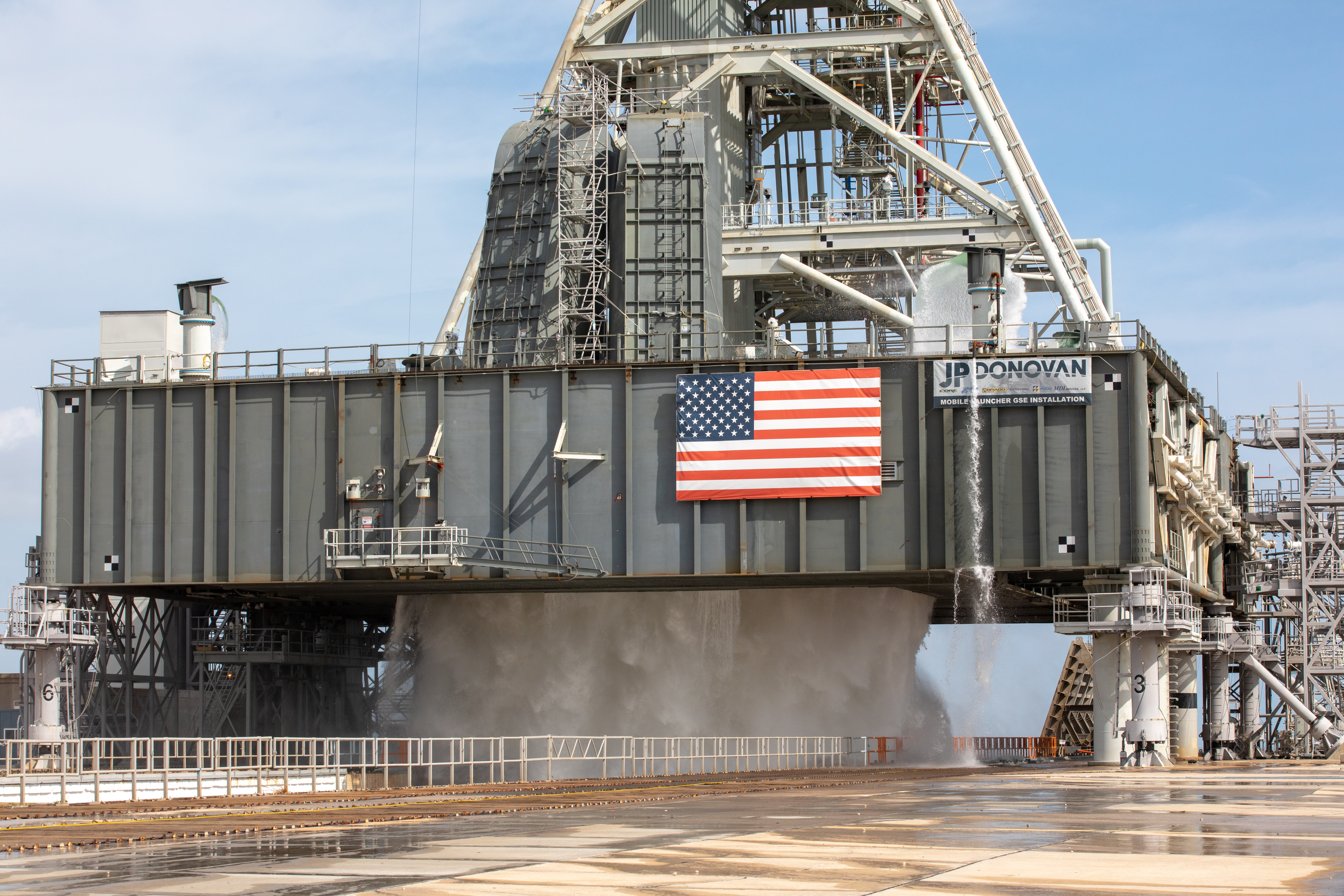 A wet flow test at Launch Pad 39B on September 13, 2019, tests the sound suppression system that will be used for launch of NASA’s Space Launch System for the Artemis I mission. During the test, about 450,000 gallons of water poured onto the Pad B flame deflector, the mobile launcher flame hole and onto the launcher’s blast deck. This was the first time the ground launch sequencer that will be used on the day of launch was used for the timing of a sound suppression test.