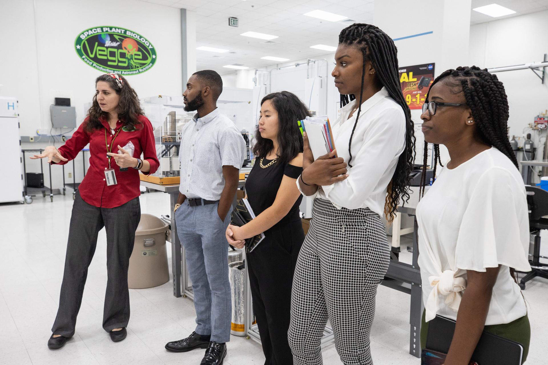 Dr. Gioia Massa, NASA Veggie project lead, addresses Langston University students, from left, Sherman Cravens, Kashia Cha, Courtney Miller and Makyah Farris inside a Space Station Processing Facility lab at Kennedy Space Center on Sept. 18, 2019. The tour, which was organized by Langston University professor Byron Quinn, Ph.D., and NASA’s Office of Education, included stops at SwampWorks, the Neil Armstrong Operations and Checkout Building, the Vehicle Assembly Building, the visitor complex and the Center for Space Education.