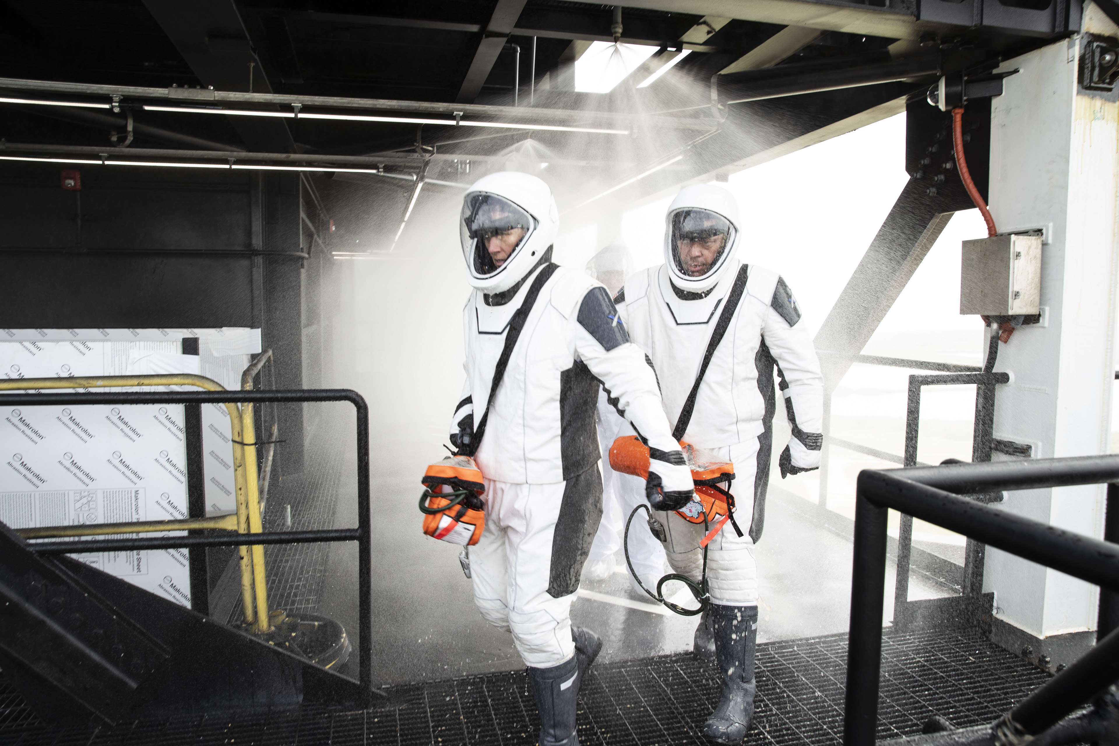 NASA and SpaceX conducted a formal verification of the company’s emergency escape system on Sept. 18, 2019, at Kennedy Space Center’s Launch Complex 39A in Florida. NASA astronauts Shannon Walker, in front, and Bob Behnken participated in the exercise to verify the crew can safely and quickly evacuate from the launch pad in the unlikely event of an emergency before liftoff of SpaceX’s first crewed flight test, called Demo-2. During the escape verification, Walker and Behnken pass through the water deluge system on the 265-foot level of the crew access tower. As Boeing and SpaceX begin to make regular flights to the International Space Station for NASA’s Commercial Crew Program, the agency will continue to advance its mission to go beyond low-Earth orbit and establish a human presence on the Moon with the ultimate goal of sending astronauts to Mars.