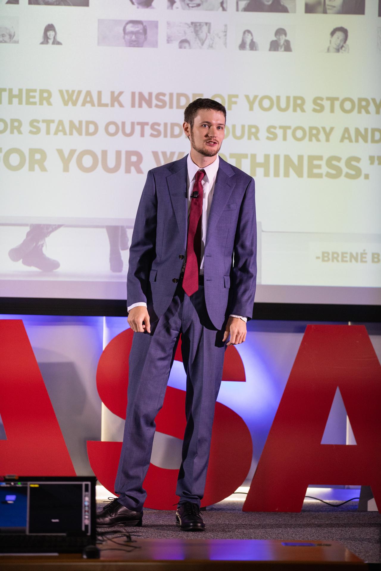 Kennedy Space Center’s Skyler Kleinschmidt speaks at the second in a series of five TED Talk-style informational sessions on Oct. 10, 2019, in the Florida spaceport’s Kennedy Learning Institute. Sponsored by Kennedy’s Launching Leaders and Leadership for the Future, NASAtalks focuses on the topic of intentional careers and aims to provide employees with tools and knowledge that can be utilized for career growth. The theme of this second session was collaboration, and additional speakers included Kennedy employees Jennifer Lane and Stephanie Martin, with a skill-building section on networking in the digital age by Madison Tuttle.