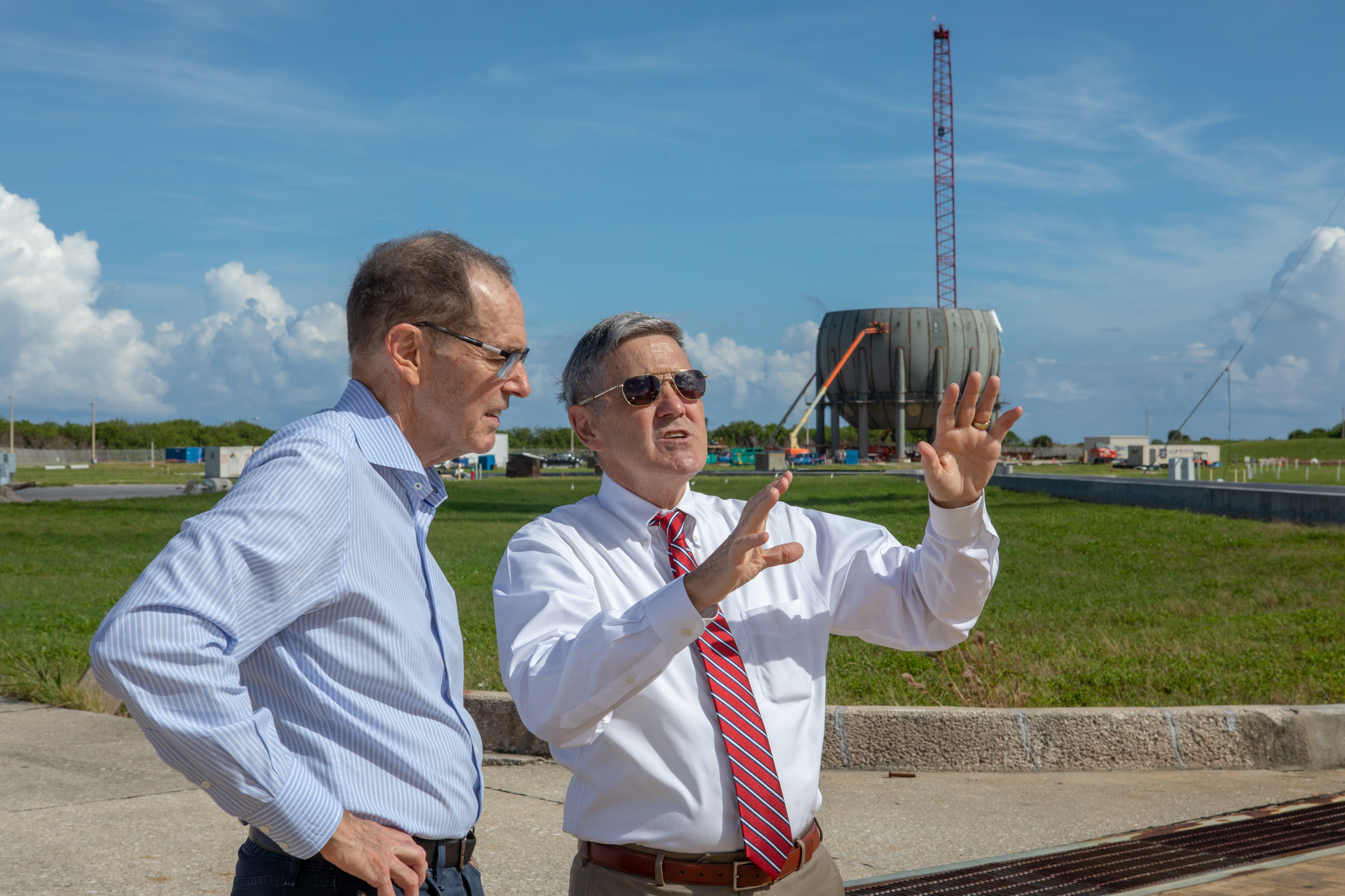 Kennedy Space Center Director Bob Cabana, at right, speaks to a member of the NASA Advisory Council at Launch Complex 39B during a tour of the multi-user spaceport on Oct. 30, 2019. In view behind them is the build-up of a new liquid hydrogen storage tank that will support Artemis launches to the Moon and on to Mars. The NASA Advisory Council provides the NASA administrator with counsel and advice on programs and issues of importance to the agency. Committee members conduct fact-finding sessions throughout the year in an effort to gain a broad understanding of current NASA issues and future mission implementation plans.