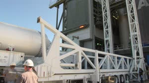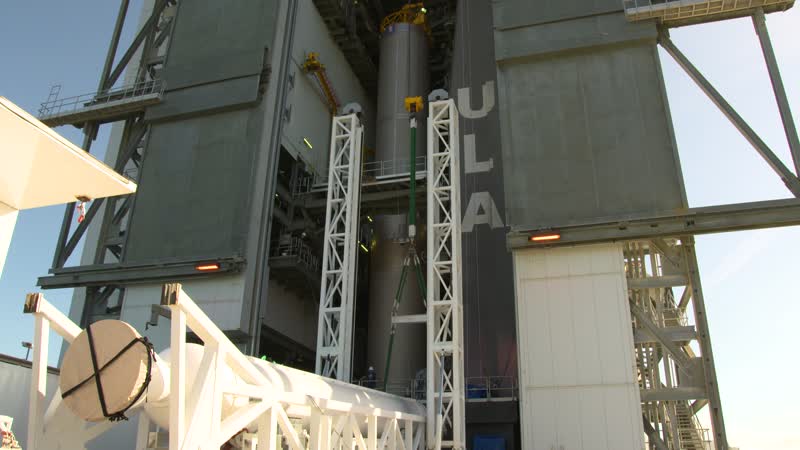 The United Launch Alliance Atlas V solid rocket booster number two is lifted to the vertical position on Nov. 7, 2019, in the Vertical Integration Facility at Space Launch Complex 41 at Cape Canaveral Air Force Station in Florida, in preparation for Boeingís Orbital Flight Test (OFT). The uncrewed OFT mission will rendezvous and dock Boeingís CST-100 Starliner spacecraft with the International Space Station as part of NASA's Commercial Crew Program. Starliner will launch atop the Atlas V rocket from Space Launch Complex 41.