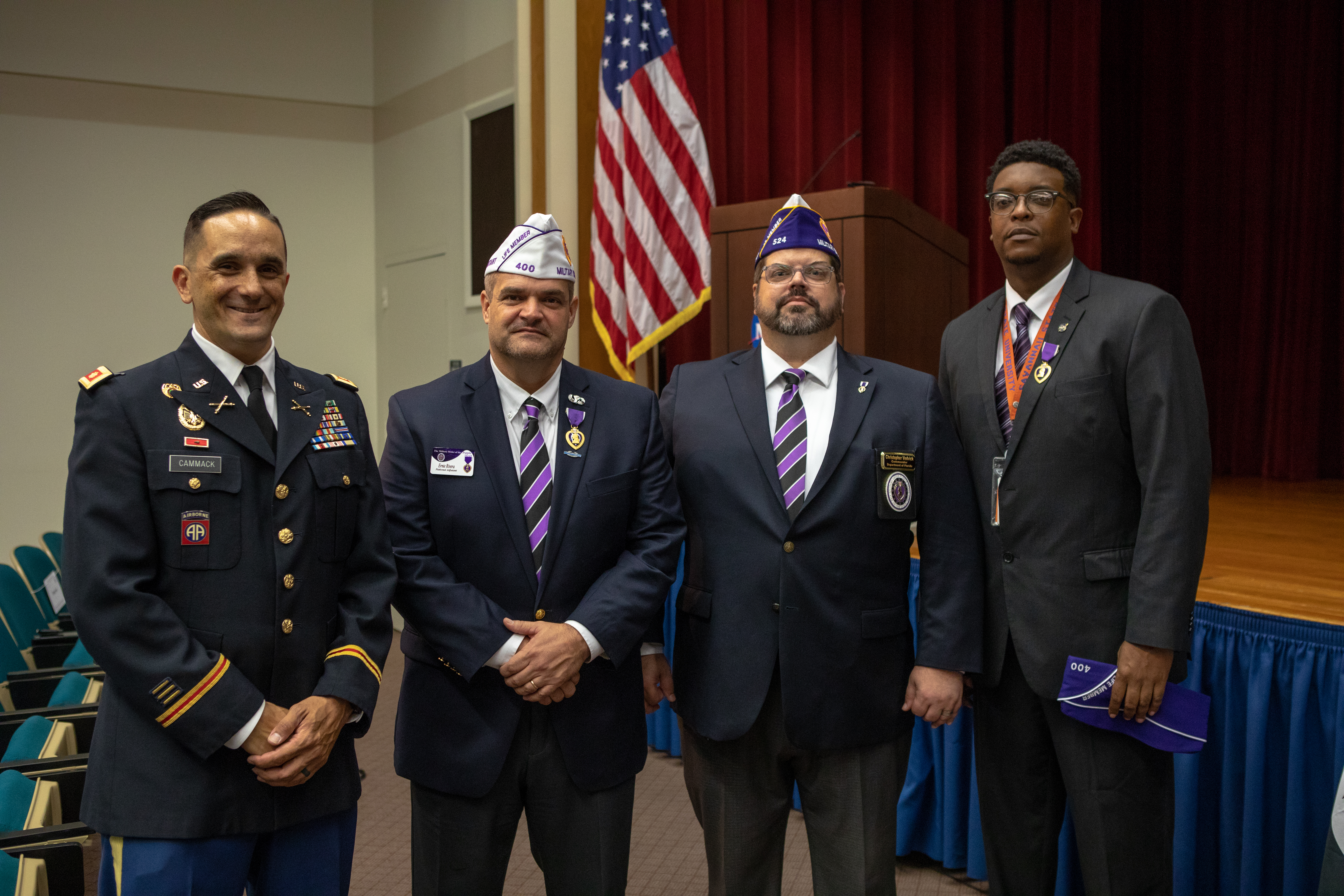 From left, NASA Public Affairs Officer Dustin Cammack, Military Order of the Purple Heart National Adjutant Ernie Rivera, Military Order of the Purple Heart Department of Florida Commander Christopher Vedvick and NASA Public Affairs Officer Derrick Matthews are photographed inside Kennedy Space Center’s Training Auditorium during a Veterans Day observance ceremony on Nov. 7, 2019. During the event, Kennedy was named a Purple Heart Entity by the Military Order of the Purple Heart, becoming the first NASA center to receive this designation for support and services provided to veterans through the Florida spaceport’s Veterans employee resource group. Attendees included Kennedy employees and more than 20 Purple Heart recipients. Following the award presentation, Vedvick, a combat wounded veteran, spoke about his experience serving in the United States Army before retiring, his involvement in the Military Order of the Purple Heart and the purpose of the organization.