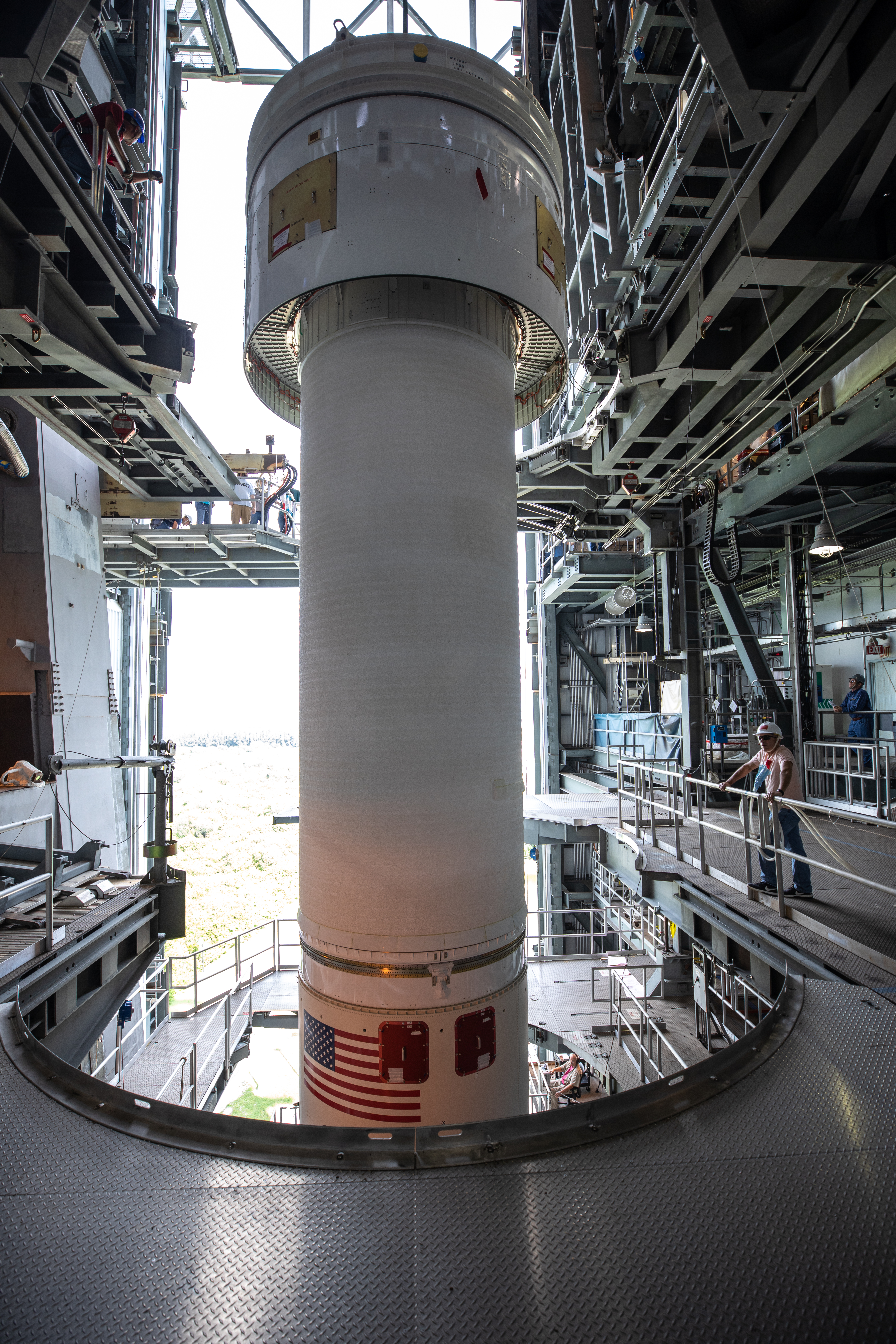 A Centaur upper stage is moved into position above the United Launch Alliance Atlas V first stage inside the Space Launch Complex 41 Vertical Integration Facility at Florida’s Cape Canaveral Air Force Station on Nov. 8, 2019, in preparation for Boeing’s Orbital Flight Test (OFT). The uncrewed OFT mission will rendezvous and dock Boeing’s CST-100 Starliner spacecraft with the International Space Station as part of NASA’s Commercial Crew Program. Starliner will launch atop the Atlas V rocket from Space Launch Complex 41.