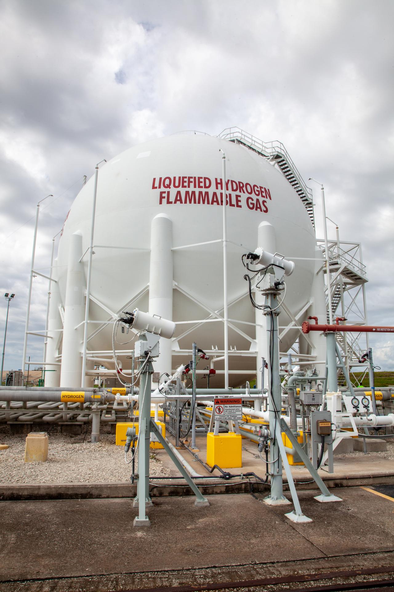 A liquid hydrogen storage tank is photographed at Launch Pad 39B on Nov. 8, 2019, at NASA’s Kennedy Space Center in Florida. The agency’s Exploration Ground Systems oversaw testing of the pad’s cryogenic systems – the infrastructure that will support the flow of liquid hydrogen and liquid oxygen from the storage tanks to the Space Launch System (SLS) rocket – in preparation for the launch of SLS with the Orion spacecraft atop for the uncrewed Artemis I mission. Each of the liquid hydrogen and liquid oxygen tanks can hold more than 800,000 gallons of propellant. The liquid hydrogen, lighter than liquid oxygen, will make its way from the tank to the rocket using gaseous hydrogen to pressurize the sphere at the time of launch, while the liquid oxygen will be sent to the rocket via pumps.