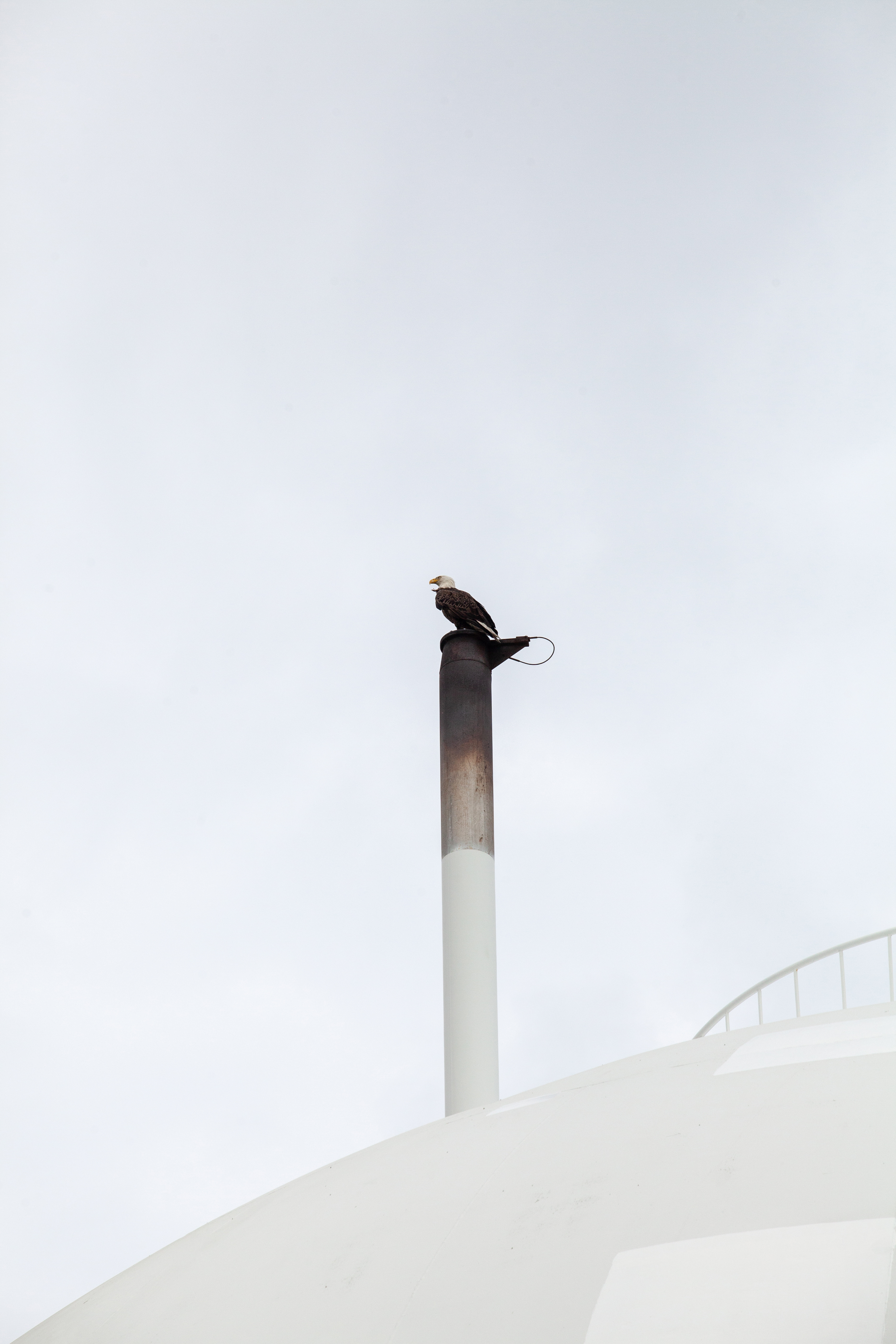 A bald eagle perches on the liquid hydrogen storage tank at Launch Pad 39B on Nov. 8, 2019, at NASA’s Kennedy Space Center in Florida. Kennedy shares a border with the Merritt Island National Wildlife Refuge, consisting of 144,000 acres of land, water and marshes. Many species of birds, reptiles, fish, amphibians and mammals can be found within the refuge.