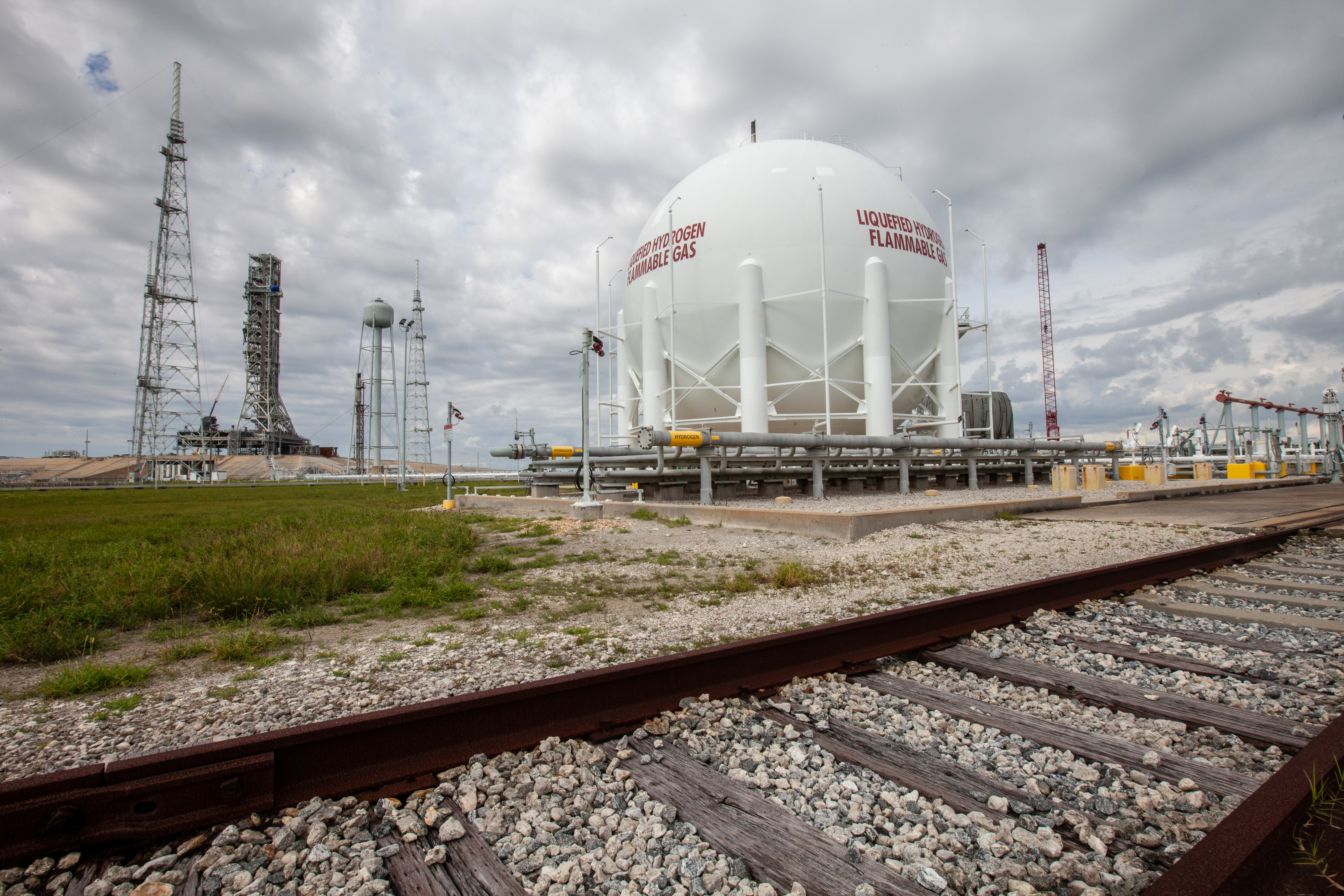 A liquid hydrogen storage tank, with a view of the mobile launcher on the pad surface in the background, is photographed at Launch Pad 39B on Nov. 8, 2019, at NASA’s Kennedy Space Center in Florida. The agency’s Exploration Ground Systems oversaw testing of the pad’s cryogenic systems – the infrastructure that will support the flow of liquid hydrogen and liquid oxygen from the storage tanks to the Space Launch System (SLS) rocket – in preparation for the launch of SLS with the Orion spacecraft atop for the uncrewed Artemis I mission. Each of the liquid hydrogen and liquid oxygen tanks can hold more than 800,000 gallons of propellant. The liquid hydrogen, lighter than liquid oxygen, will make its way from the tank to the rocket using gaseous hydrogen to pressurize the sphere at the time of launch, while the liquid oxygen will be sent to the rocket via pumps.