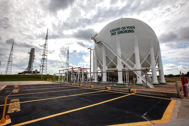 A liquid oxygen storage tank, with a view of the mobile launcher on the pad surface in the background, is photographed at Launch Pad 39B on Nov. 8, 2019, at NASA’s Kennedy Space Center in Florida. The agency’s Exploration Ground Systems oversaw testing of the pad’s cryogenic systems – the infrastructure that will support the flow of liquid hydrogen and liquid oxygen from the storage tanks to the Space Launch System (SLS) rocket – in preparation for the launch of SLS with the Orion spacecraft atop for the uncrewed Artemis I mission. Each of the liquid oxygen and liquid hydrogen tanks can hold more than 800,000 gallons of propellant. The liquid oxygen will require the use of pumps to push it from the tank to the rocket, while the lighter liquid hydrogen will make its way up to the pad using gaseous hydrogen to pressurize the sphere.