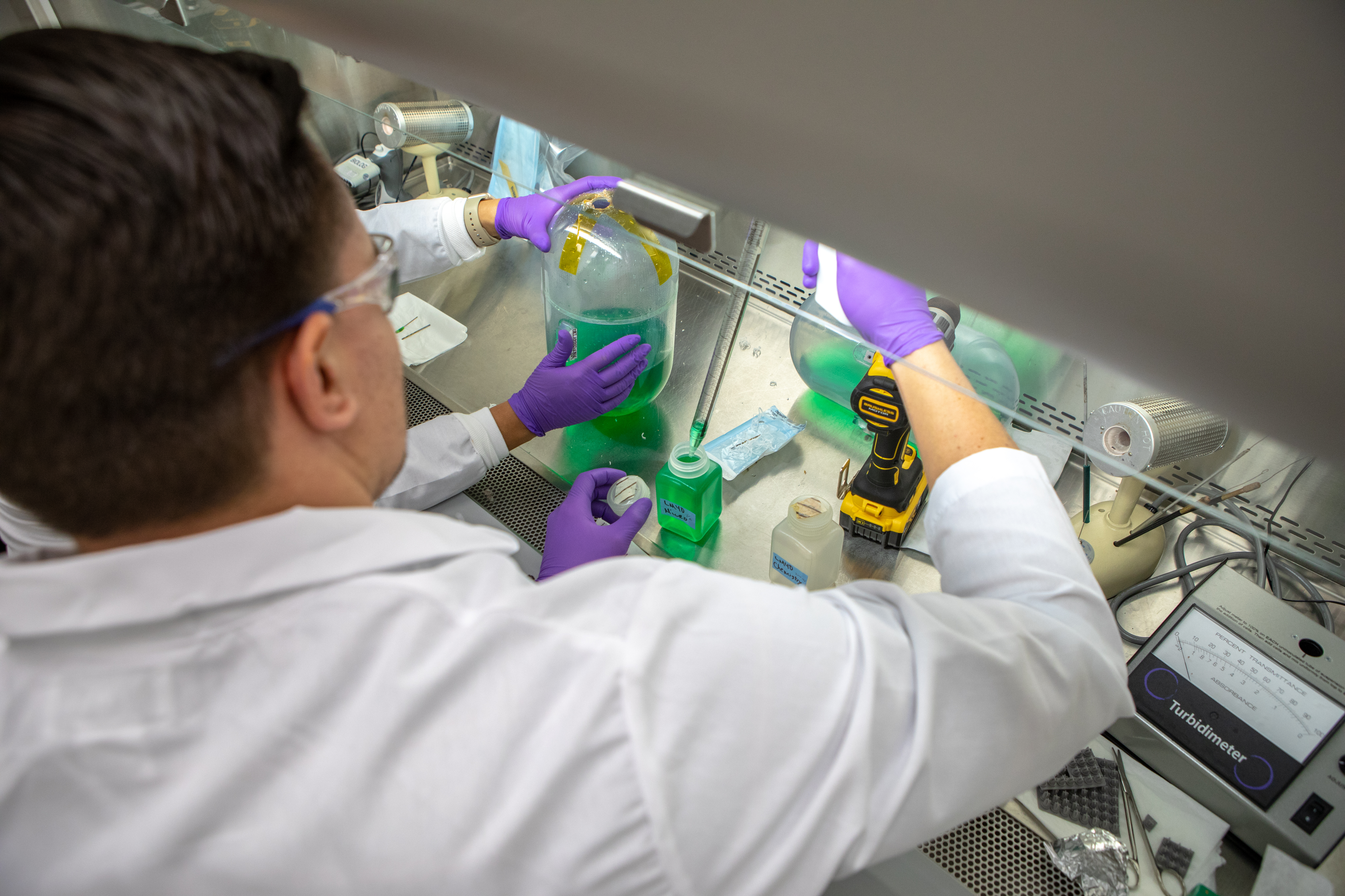 A Kennedy Space Center employee collects samples from a water tank, filled with green dye, for a biological study in the Florida spaceport’s Neil Armstrong Operations and Checkout Building on Nov. 13, 2019. Two tanks have recently returned to Kennedy after spending the last five years on the International Space Station for an experiment to study slosh, or the movement of water, in a zero-gravity environment to help engineers predict the movement of propellant in rocket tanks. With the slosh experiment now concluded, the tanks are being utilized to determine if there is, or was, any microbial growth within them. The results will help NASA determine whether clean water can be stored in space for long-duration missions, an essential component to keeping astronauts safe and healthy as the agency prepares for missions to the Moon and beyond to Mars.