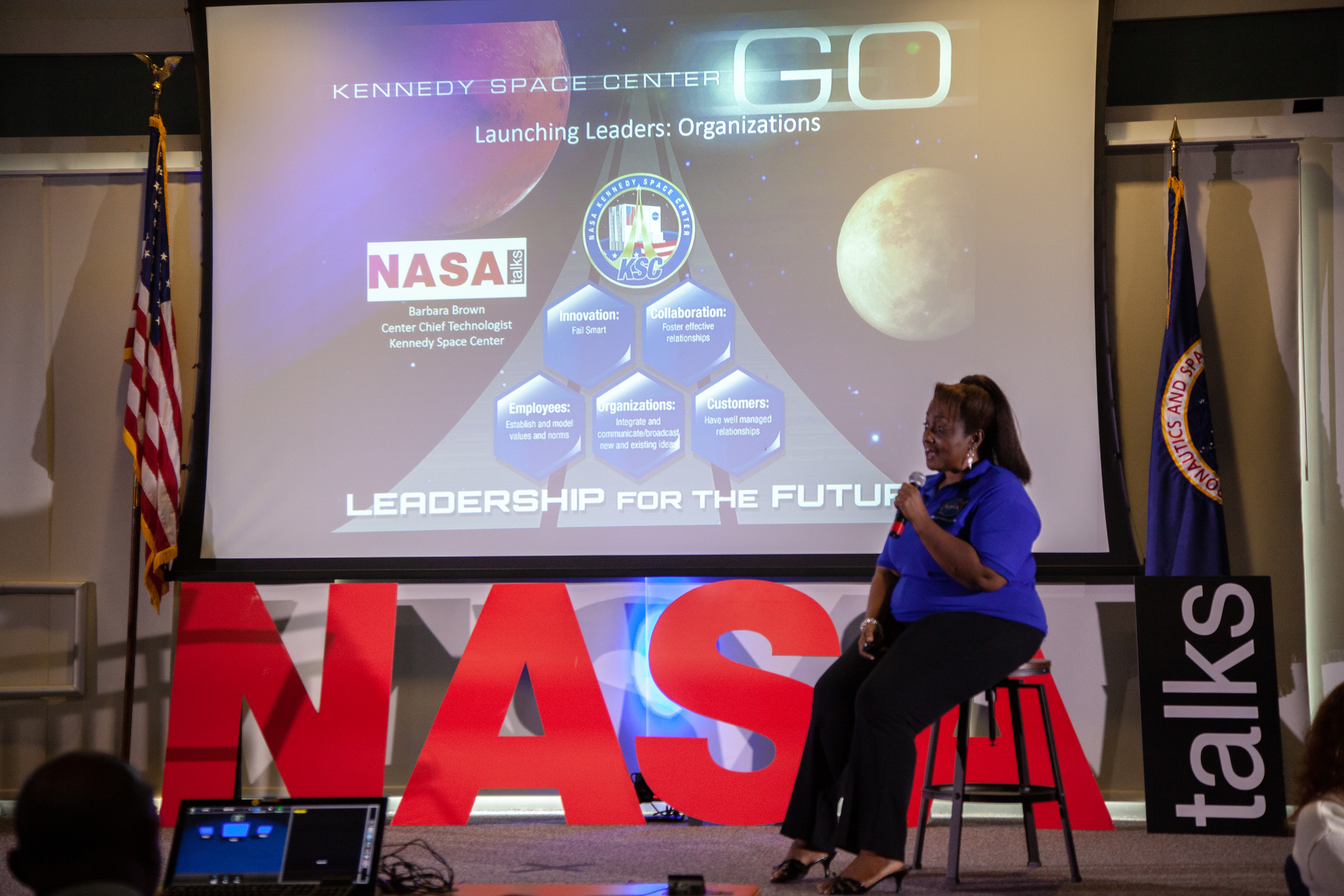Barbara Brown, chief technologist at NASA’s Kennedy Space Center in Florida, speaks at the fifth and final TED Talk-style informational session on Nov. 14, 2019, in the Kennedy Learning Institute. Sponsored by Kennedy’s Launching Leaders and Leadership for the Future, NASAtalks focuses on the topic of intentional careers and aims to provide employees with tools and knowledge that can be utilized for career growth. The theme of this session was organizations, and additional speakers included Director of Engineering Shawn Quinn, Chief Counsel Dan Shaver and Tim Dunn, launch director for the agency’s Launch Services Program, with a skill-building section on vision by Mark Wiese, logistics element manager for the Gateway Program.