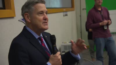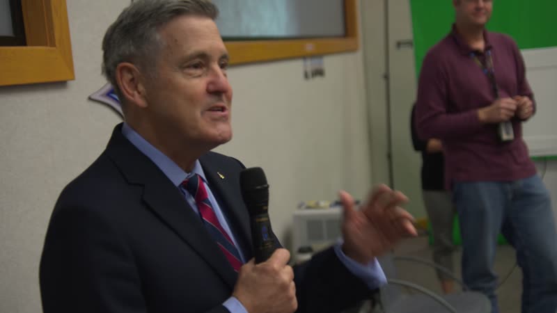 KENNEDY SPACE CENTER, FLA. - NASA Associate Administrator for Space Flight William F. Readdy addresses a group of KSC employees assembled in the KSC Training Auditorium. The occasion is the announcement of James W. Kennedy as the next director of the NASA Kennedy Space Center (KSC) in Florida. Kennedy has served as KSC's deputy director since November 2002. He will succeed KSC Director Roy D. Bridges, who was appointed on June 13 to lead NASA's Langley Research Center, Hampton, Va.