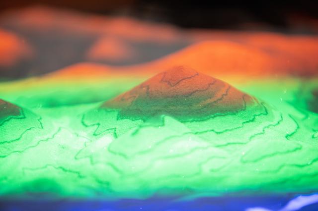 An interactive augmented reality sandbox, used by Swamp Works personnel to visually demonstrate the work being done in the Granular Mechanics and Regolith Operations laboratory at the Kennedy Space Center to produce high-fidelity models of rocket plume impingement on the lunar surface, is photographed during an innovation showcase on Nov. 19, 2019. Nearly 50 exhibitors gathered in the Florida spaceport’s Neil Armstrong Operations and Checkout Building’s Mission Briefing Room to participate in the center’s Innovation Days – one of several events throughout the year aimed at fostering an encouraging an innovative culture at Kennedy. Showcase participants included individuals from multiple directorates, programs and organizations throughout Kennedy. In addition to the showcase, employees had the opportunity to attend an overview presentation on NASA’s Human Landing System (HLS), hosted by HLS Program Manager Lisa Watson-Morgan.