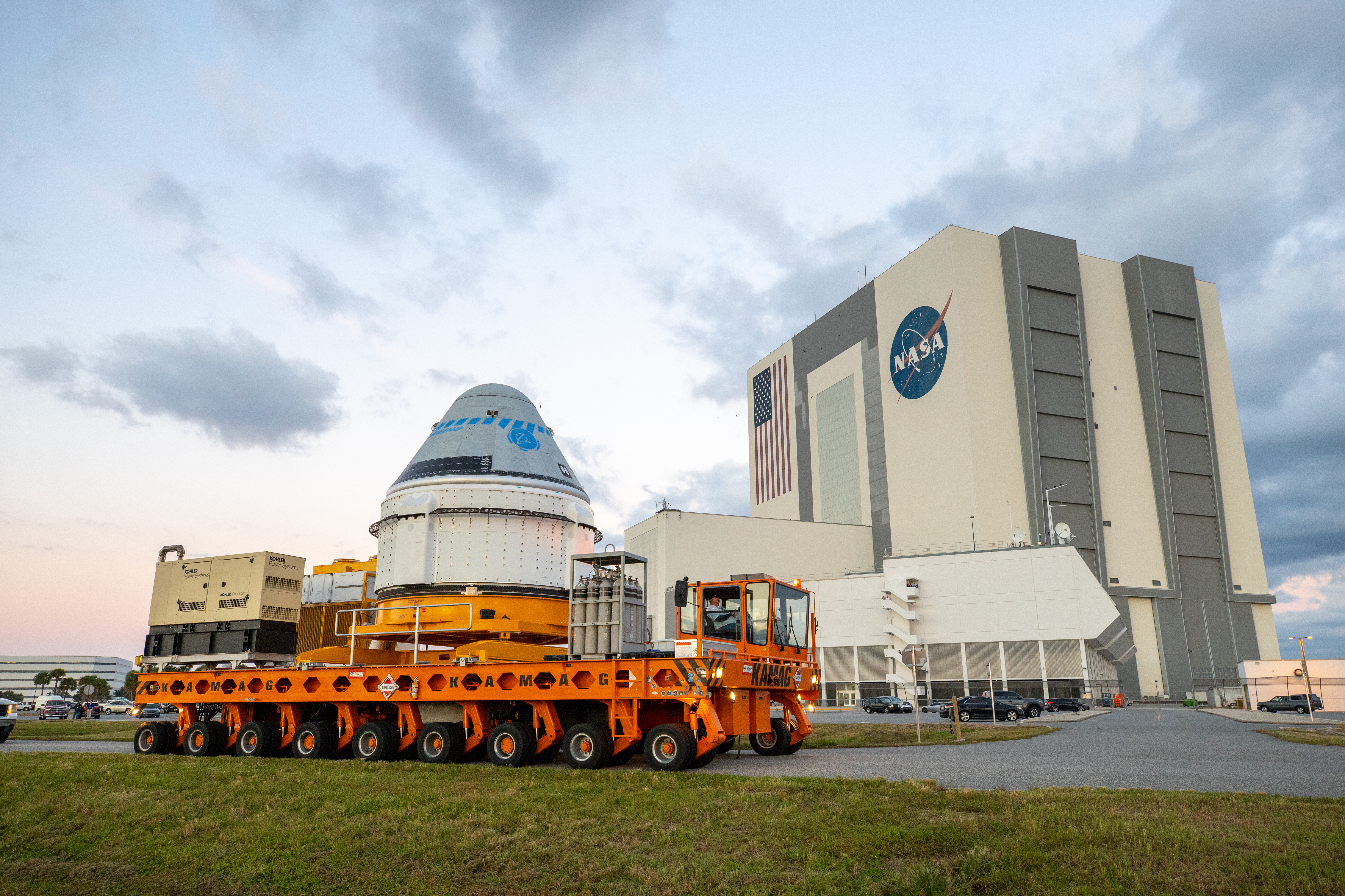Boeing’s CST-100 Starliner spacecraft passes by the Vehicle Assembly Building at NASA’s Kennedy Space Center in Florida on Nov. 21, 2019, making its way to the Space Launch Complex 41 Vertical Integration Facility at Cape Canaveral Air Force Station. At the pad, Starliner will be secured atop a United Launch Alliance Atlas V rocket in preparation for Boeing’s uncrewed Orbital Flight Test to the International Space Station for NASA’s Commercial Crew Program.