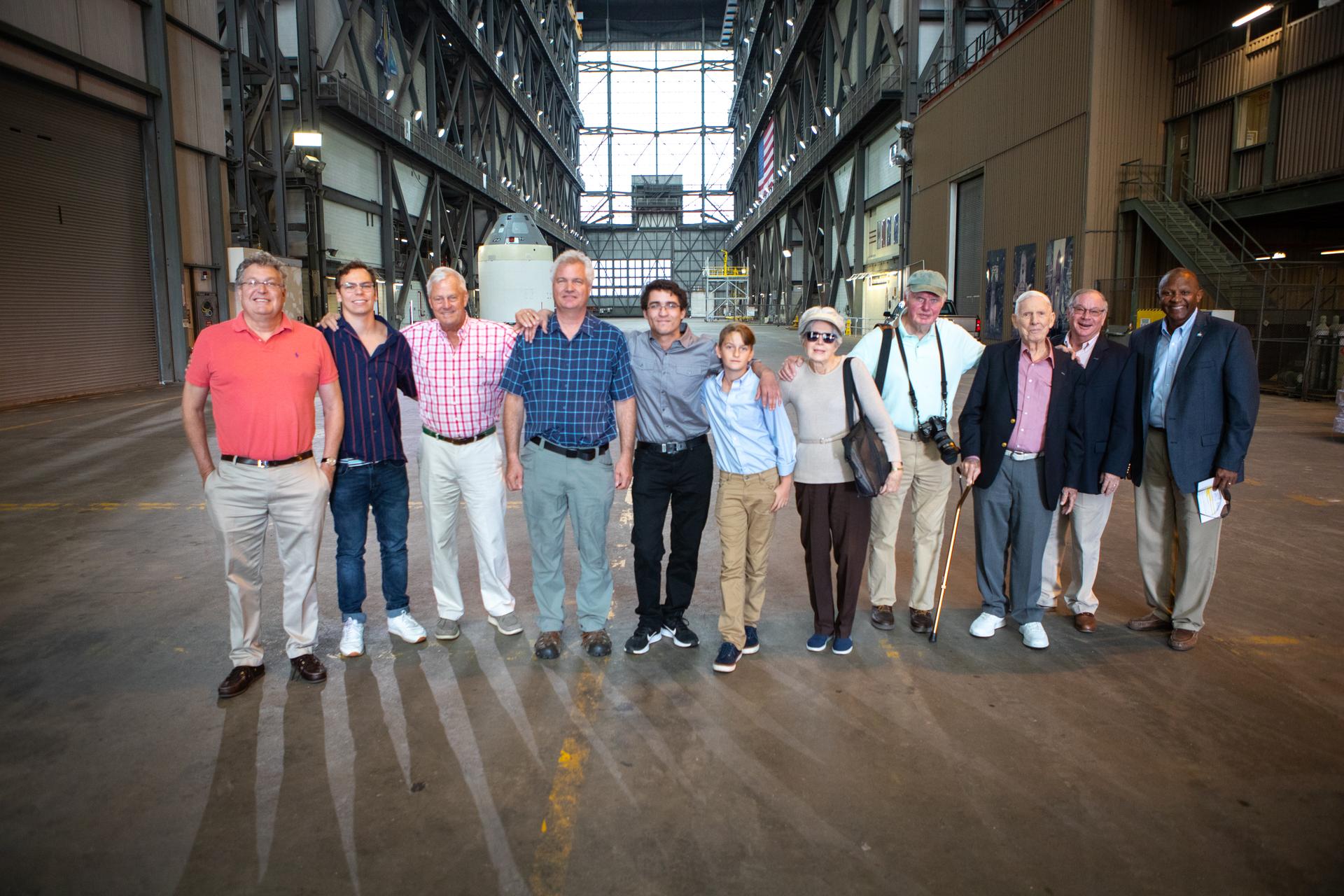 Phil Moyer, third from right, original project lead for the Vehicle Assembly Building (VAB); and Dick Bergmann, fourth from right, original lead designer for the VAB, tour the iconic facility with the families of the original architect on Nov. 22, 2019 at NASA’s Kennedy Space Center in Florida. At far right is Kelvin Manning, Kennedy’s associate director, technical. The Florida Section American Society of Civil Engineers bestowed the historic building with its National Historic Civil Engineering Landmark award during a ceremony on Jan. 10, 2020. The VAB is the first building at Kennedy Space Center to earn this distinction. At the time of its completion, the 129-million-cubic-foot structure was the largest building in the world. Originally designed and built to accommodate the Saturn V/Apollo used in Project Apollo, the VAB was later modified for its role in the Space Shuttle Program.