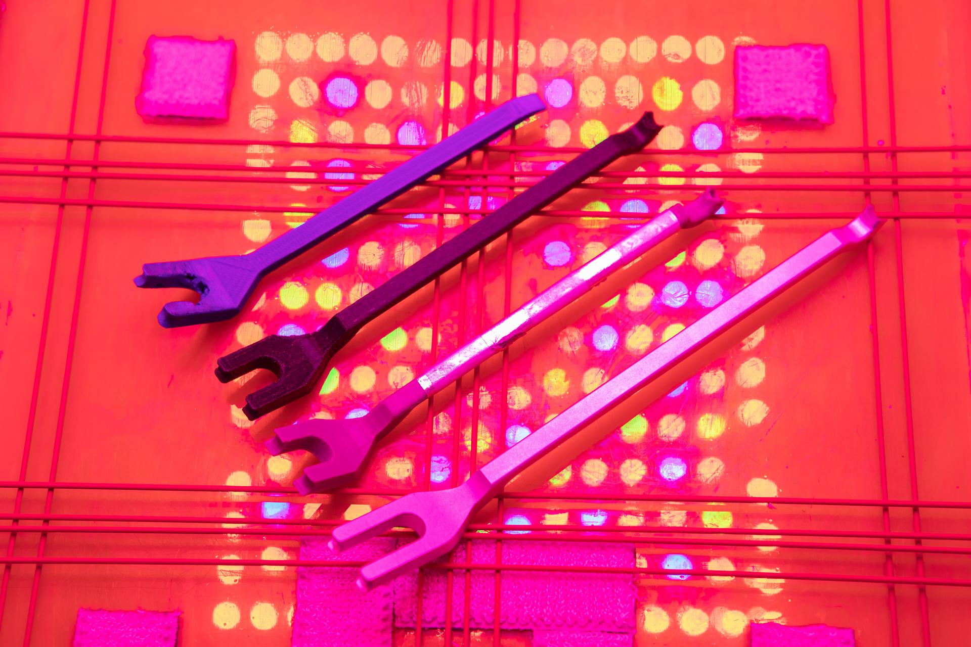 This photograph shows the evolution of the bungee tool as it went from a simple, 3D-printed object to an increasingly refined tool designed to save astronauts time when they work with the bungee system in the Veggie plant chamber aboard the International Space Station. The bungee tool is utilized to manipulate the bungee cords that help secure vital parts of plant experiments on the orbiting laboratory.