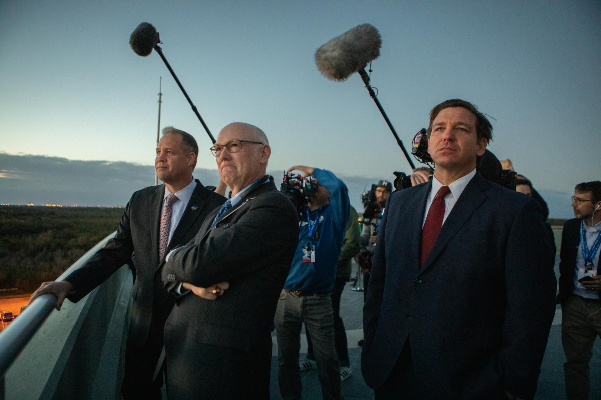 From left to right, NASA Administrator Jim Bridenstine; Tory Bruno, president and chief executive officer of United Launch Alliance; and Florida Governor Ron DeSantis wait at NASA’s Kennedy Space Center in Florida to see the liftoff of a United Launch Alliance Atlas V rocket carrying Boeing’s CST-100 Starliner spacecraft for Boeing’s Orbital Flight Test, Dec. 20, 2019. Liftoff occurred at 6:36 a.m. EST from Space Launch Complex 41 at Florida’s Cape Canaveral Air Force Station. The uncrewed Orbital Flight Test is the Starliner’s first flight for NASA’s Commercial Crew Program.