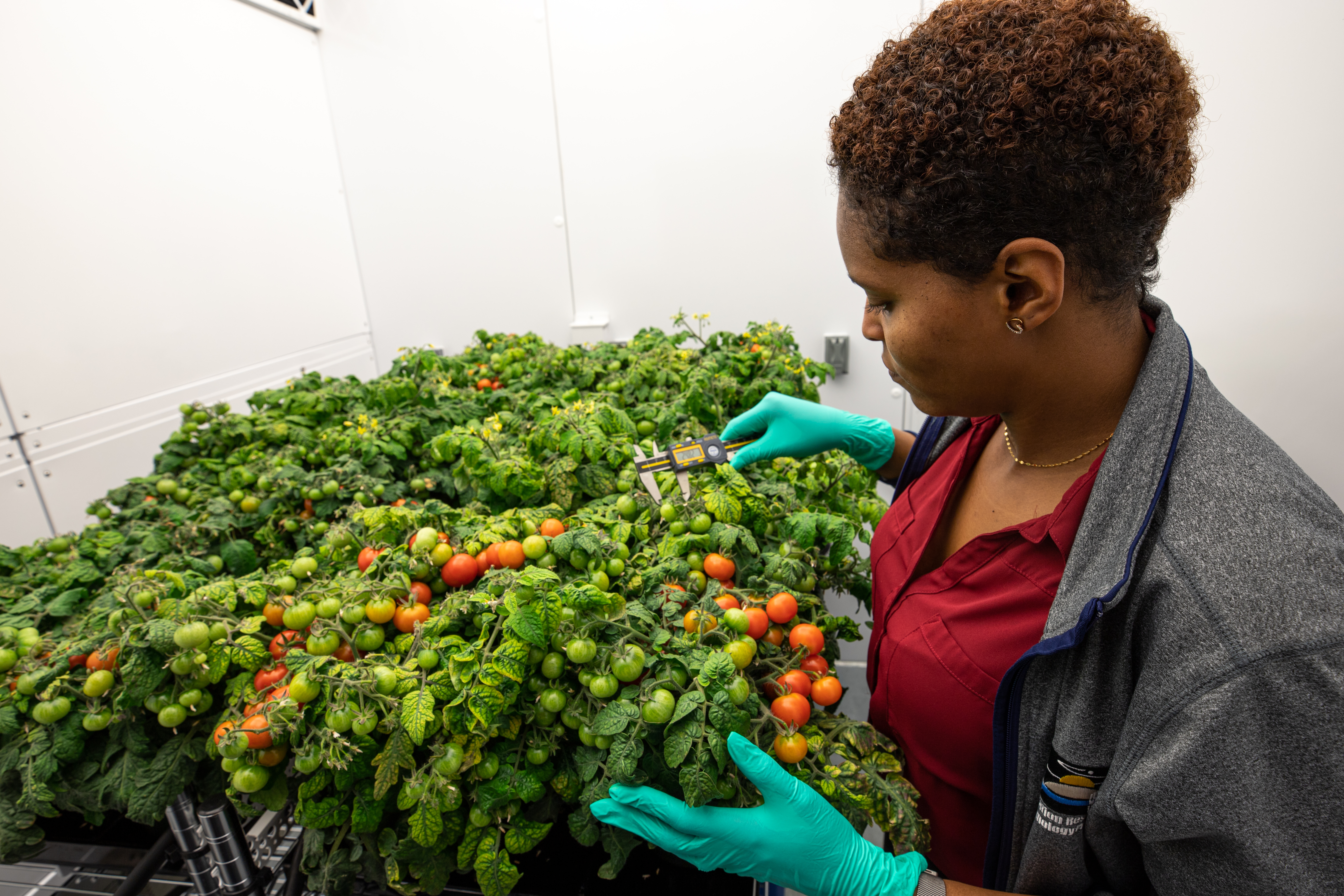 Lashelle Spencer, plant scientist with the Laboratory Support Services and Operations (LASSO) contract at NASA’s Kennedy Space Center in Florida, takes measurements on ‘Red Robin’ dwarf tomato plants, Jan. 10, 2020, inside a laboratory in the spaceport’s Space Station Processing Facility. The tomatoes are growing from seeds that have been exposed to simulated solar particle radiation. The plants’ edible mass and nutrients will be measured and compared to those of a control crop, grown from non-irradiated seeds. The project was designed to confirm that nutritious, high-quality produce can be reliably grown in deep space, or to provide a baseline to guide development of countermeasures to protect future crop foods from radiation during missions beyond low-Earth orbit. The investigation on space radiation impact on seeds and crop production also will be carried on the Materials International Space Station Experiment (MISSE) platform outside the station, supported NASA’s Space Technology Mission Directorate and the Space Biology Program, and potentially on future beyond-low-Earth platforms.