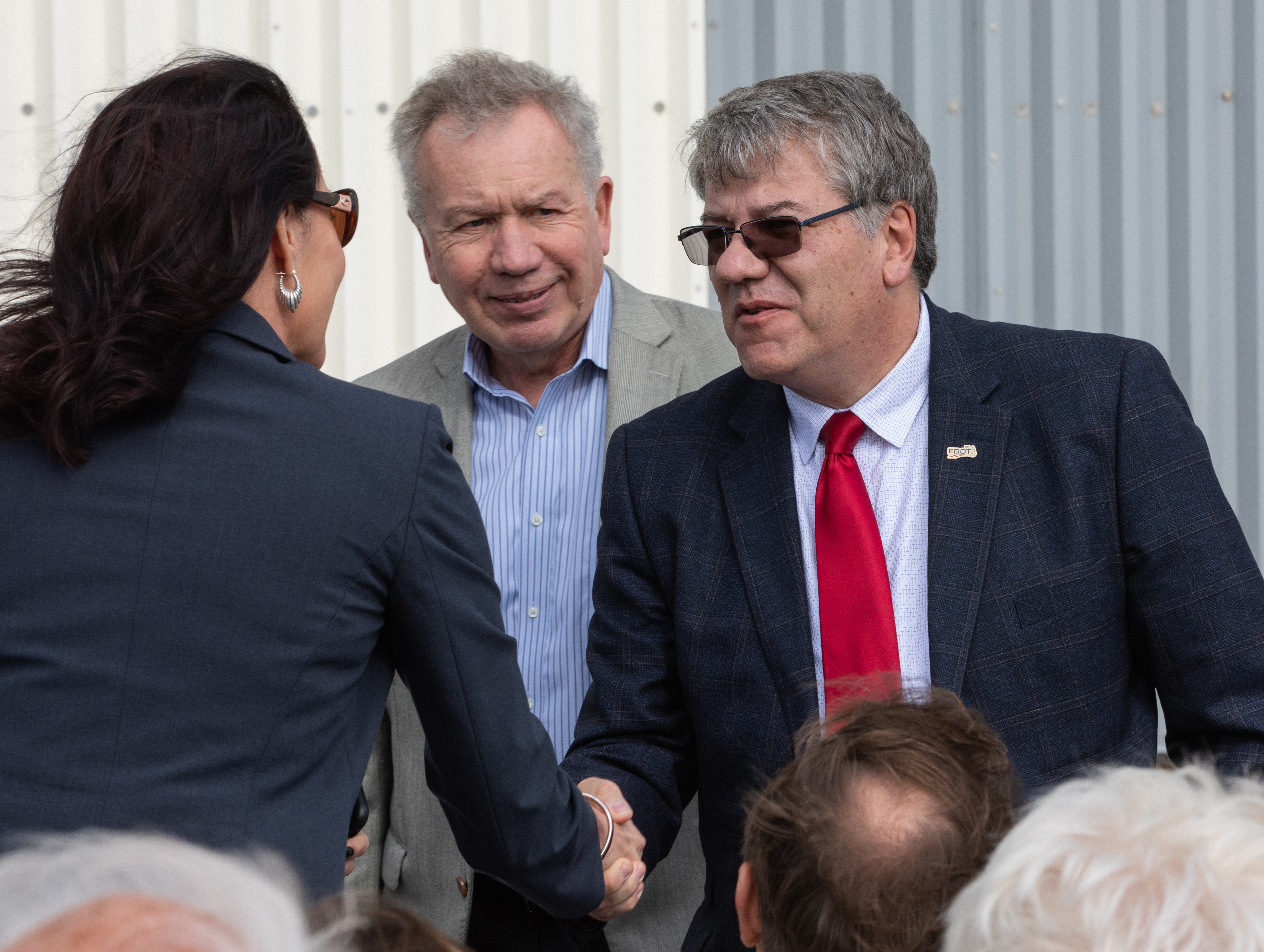 Florida Department of Transportation Secretary Kevin Thibault shakes hands with an attendee during a ceremony on Jan. 10, 2020, to recognize the Vehicle Assembly Building with the National Historic Civil Engineering Landmark award. The Florida Section American Society of Civil Engineers (ASCE) nominated the historic building and bestowed the award. Standing next to Thibault is Glenn Bell, ASCE Society of Structural Engineering Institute president. The VAB is the first building at Kennedy Space Center to earn this distinction. At the time of its completion, the 129-million-cubic-foot structure was the largest building in the world. Originally designed and built to accommodate the Saturn V/Apollo used in Project Apollo, the VAB was later modified for its role in the Space Shuttle Program.