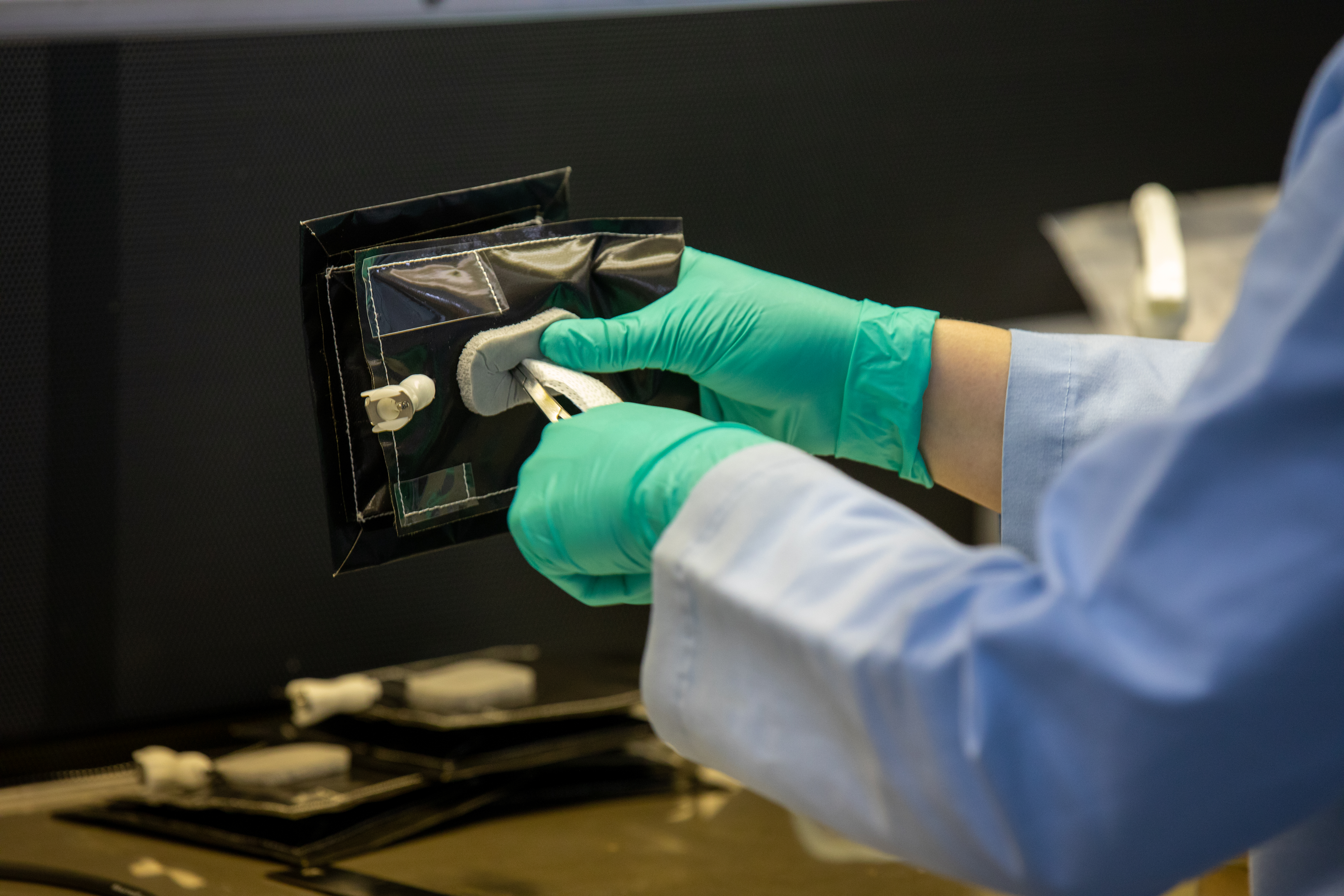 Jess Bunchek, a pseudonaut and associate scientist at NASA’s Kennedy Space Center in Florida, places the seed wick – which plant seeds will be glued into later – in a plant pillow inside the Space Station Processing Facility on Jan. 16, 2020. A common method used to grow plants in space, the pillows are being sent to the International Space Station for a series of VEG-03 experiments that will study the growth of three types of leafy greens and a new seed handling material in a microgravity environment. The experiments will be launched to the orbiting laboratory aboard a Northrop Grumman Antares rocket and Cygnus spacecraft on the company’s 13th resupply services mission. Liftoff is scheduled for Feb. 9, 2020, at 5:39 p.m. EST from the agency’s Wallops Flight Facility in Virginia.