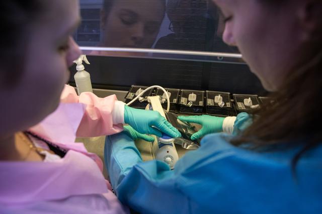 On Jan. 21, 2020, inside the Space Station Processing Facility at NASA’s Kennedy Space Center in Florida, intern Emily Kennebeck (left) and Jess Bunchek, a pseudonaut and associate scientist, prepare plant pillows for their upcoming flight to the International Space Station. The pillows, which are a common method used to grow plants in space, are being sent to the orbiting laboratory on Northrop Grumman’s 13th resupply services (NG-13) mission for a series of VEG-03 experiments that will study the growth of three types of leafy greens in a microgravity environment. Once the pillows are assembled and packaged for flight, they will be transported to the agency’s Wallops Flight Facility in Virginia, where liftoff will occur. NG-13 is scheduled to launch on Feb. 9, 2020, at 5:39 p.m.