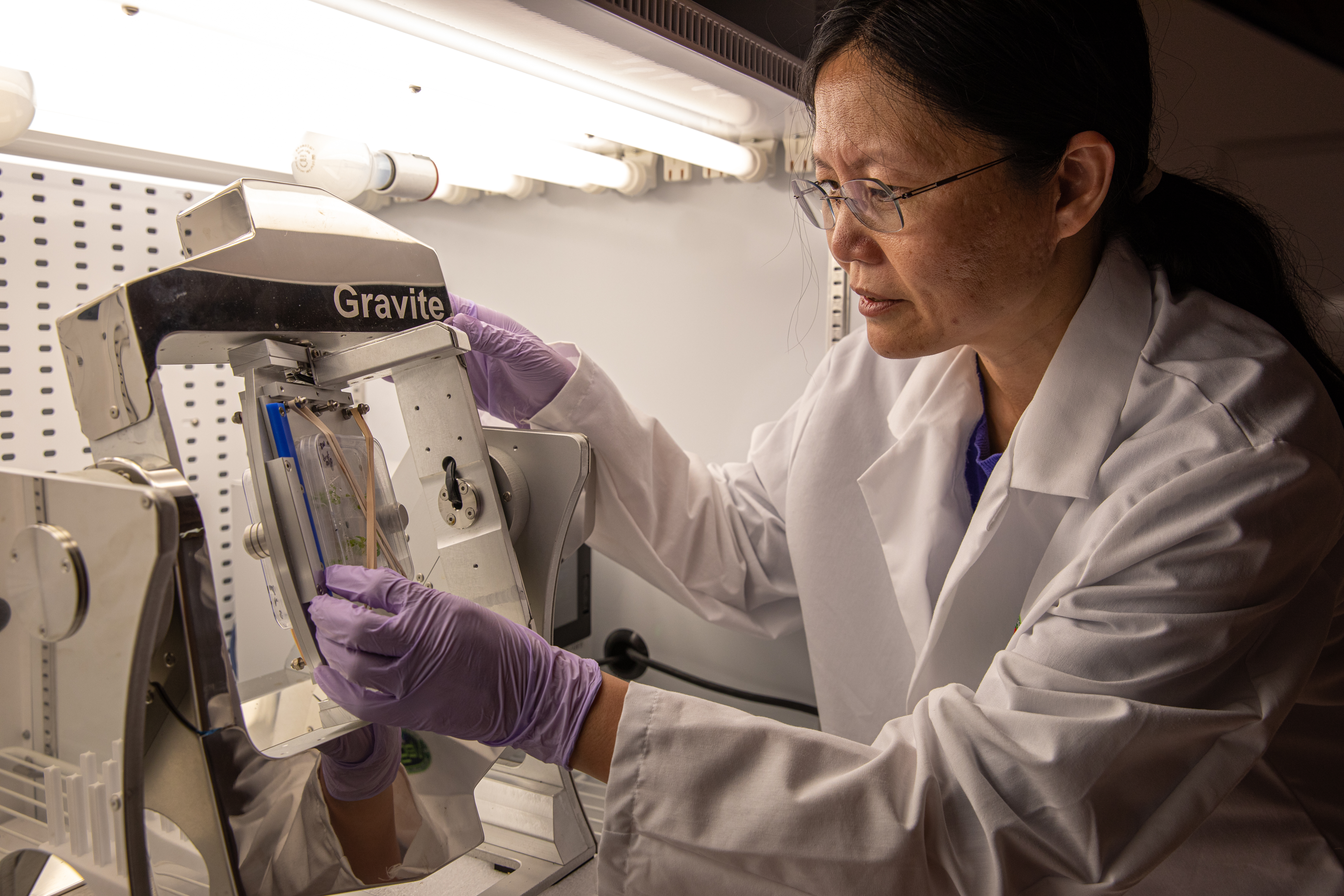 Ye Zhang, a project scientist at NASA’s Kennedy Space Center in Florida, makes adjustments to a Gravite 3d clinostat in the Microgravity Simulation Support Facility (MSSF) inside the Neil Armstrong Operations and Checkout building at on Feb. 11, 2020. The facility was developed to provide ground simulation capability to the U.S. research community in order to supplement the limited opportunities to access the International Space Station and other platforms for microgravity research. The MSSF is designed to support biological research on microorganisms, cells, tissues, small plants and small animals. The simulator provides NASA with an alternative platform for microgravity research and creates the opportunity to conduct experiments on the space station in parallel with conditions of simulated microgravity on the ground.