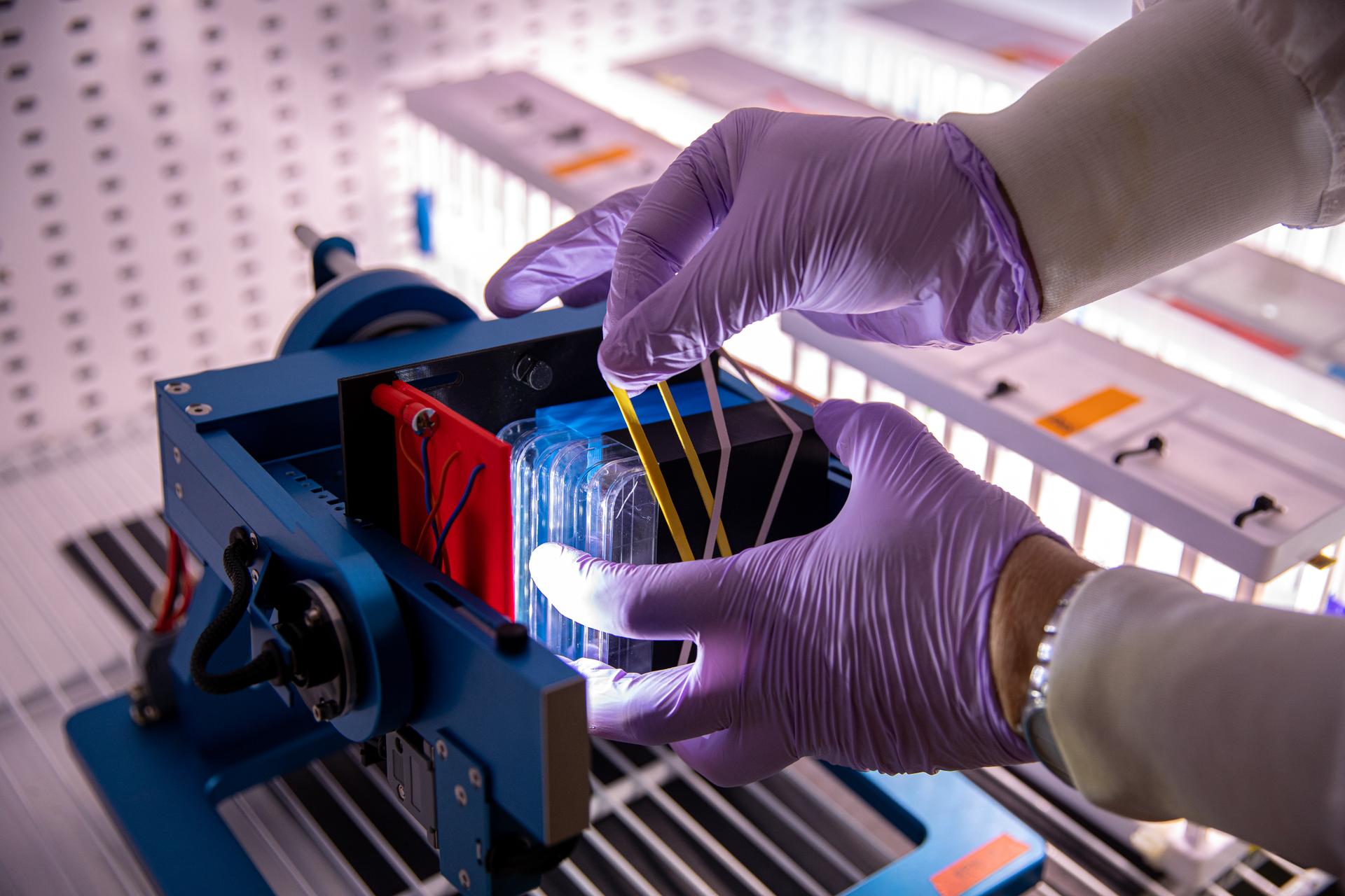 Jeffrey Richards, a payload research and science coordinator on the LASSO contract at NASA’s Kennedy Space Center in Florida, prepares an experiment for a test in an Airbus Random Positioning Machine in the Microgravity Simulation Support Facility (MSSF) inside the Neil Armstrong Operations and Checkout building at NASA’s Kennedy Space Center in Florida on Feb. 11, 2020. The facility was developed to provide ground simulation capability to the U.S. research community in order to supplement the limited opportunities to access the International Space Station and other platforms for microgravity research. The MSSF is designed to support biological research on microorganisms, cells, tissues, small plants and small animals. The simulator provides NASA with an alternative platform for microgravity research and creates the opportunity to conduct experiments on the space station in parallel with conditions of simulated microgravity on the ground.
