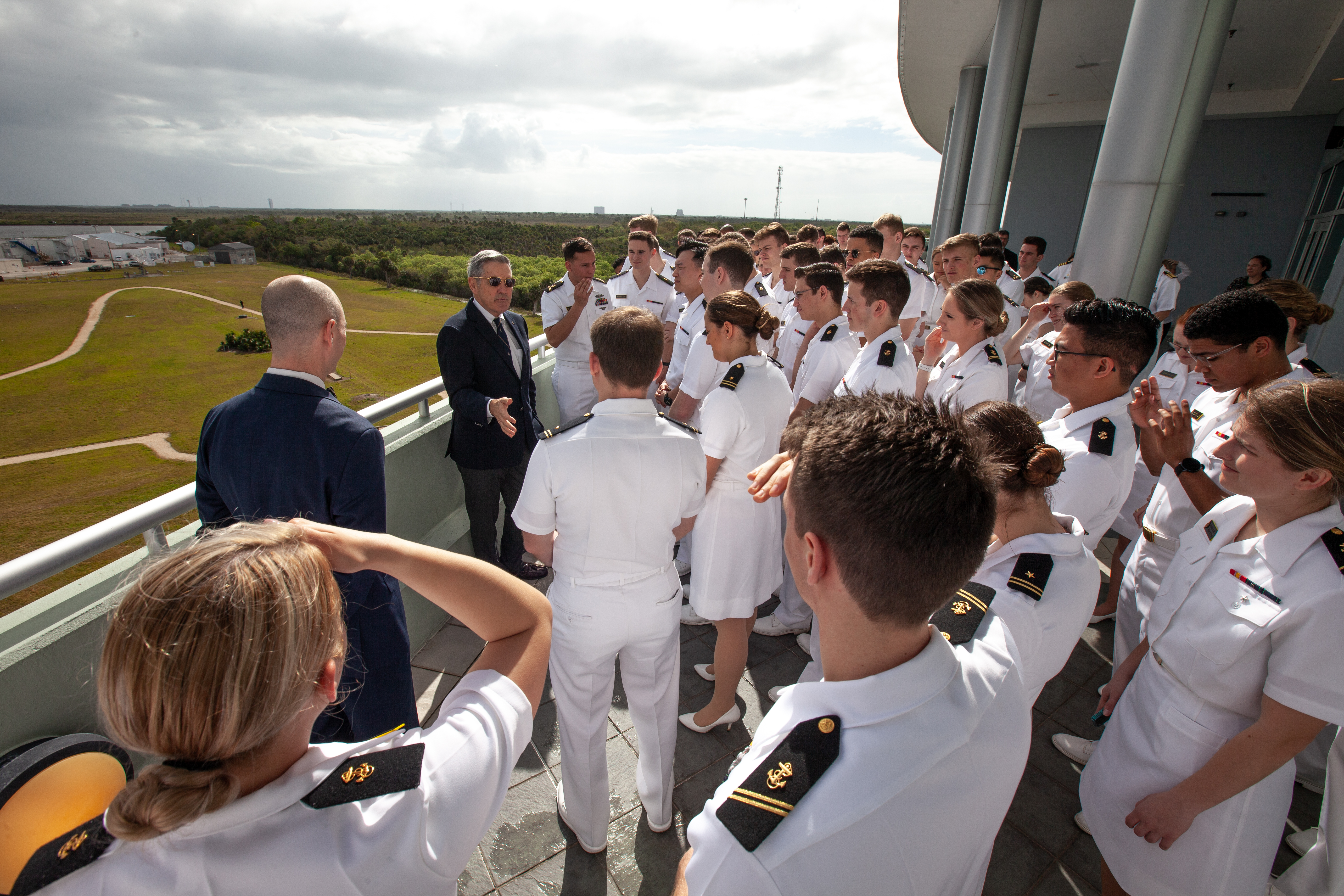 Kennedy Space Center Director Bob Cabana addresses members of the United States Naval Academy Glee Club at the Florida spaceport on March 10, 2020. The highly acclaimed Glee Club, which performed for Kennedy employees, has achieved prominence as one of America’s premier choral ensembles. As part of the celebration, Cabana discussed the deep historical ties between NASA and the U.S. Navy.