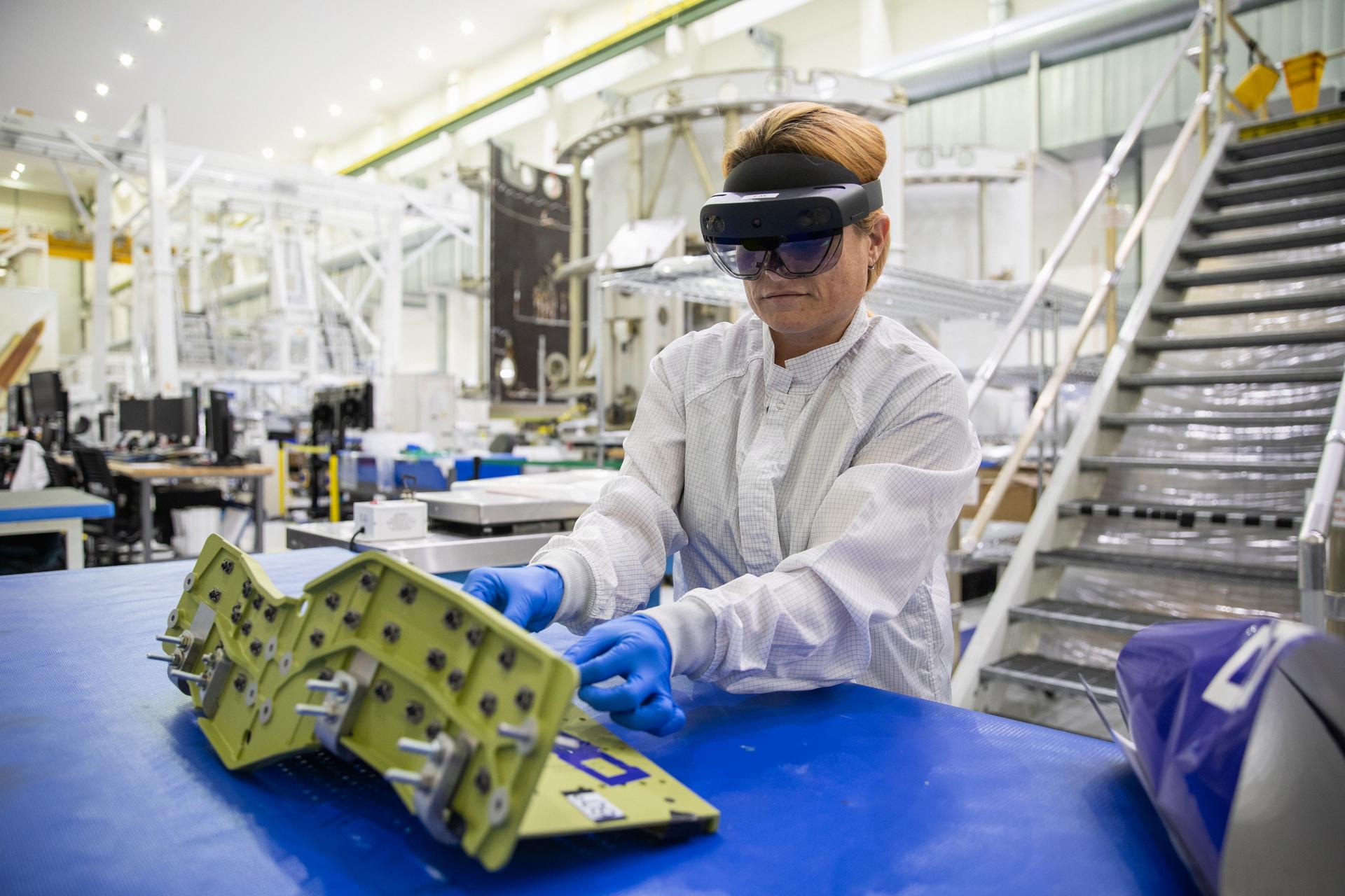 Jennifer Solano, with Lockheed Martin at Kennedy Space Center in Florida, wears a pair of augmented reality (AR) goggles to work on crew module hardware for NASA’s Artemis II mission inside the high bay of the Neil Armstrong Operations and Checkout Building at Kennedy on March 18, 2020. Orion manufacturer Lockheed Martin provided the goggles to technicians to help place tapes where components will be installed on Orion for Artemis II, the first crewed mission aboard the spacecraft. Using the AR goggles saves significant labor and time to complete tasks. Manufactured by Microsoft, the goggles, called HoloLens2, are the second version used by Lockheed.