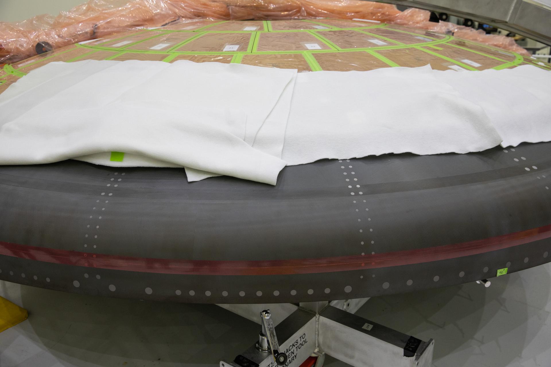 The heat shield for NASA’s Artemis II mission is in view inside the Neil Armstrong Operations and Checkout Building at the agency’s Kennedy Space Center in Florida on March 18, 2020. Using augmented reality (AR) goggles, technicians are completing the work on the heat shield. Orion manufacturer Lockheed Martin provided the goggles to technicians to help place tapes where components will be installed on the crew module, heat shield and other components for Artemis II, the first crewed mission aboard the spacecraft. Using the AR goggles saves significant labor and time to complete tasks. Manufactured by Microsoft, the goggles, called HoloLens2, are the second version used by Lockheed.