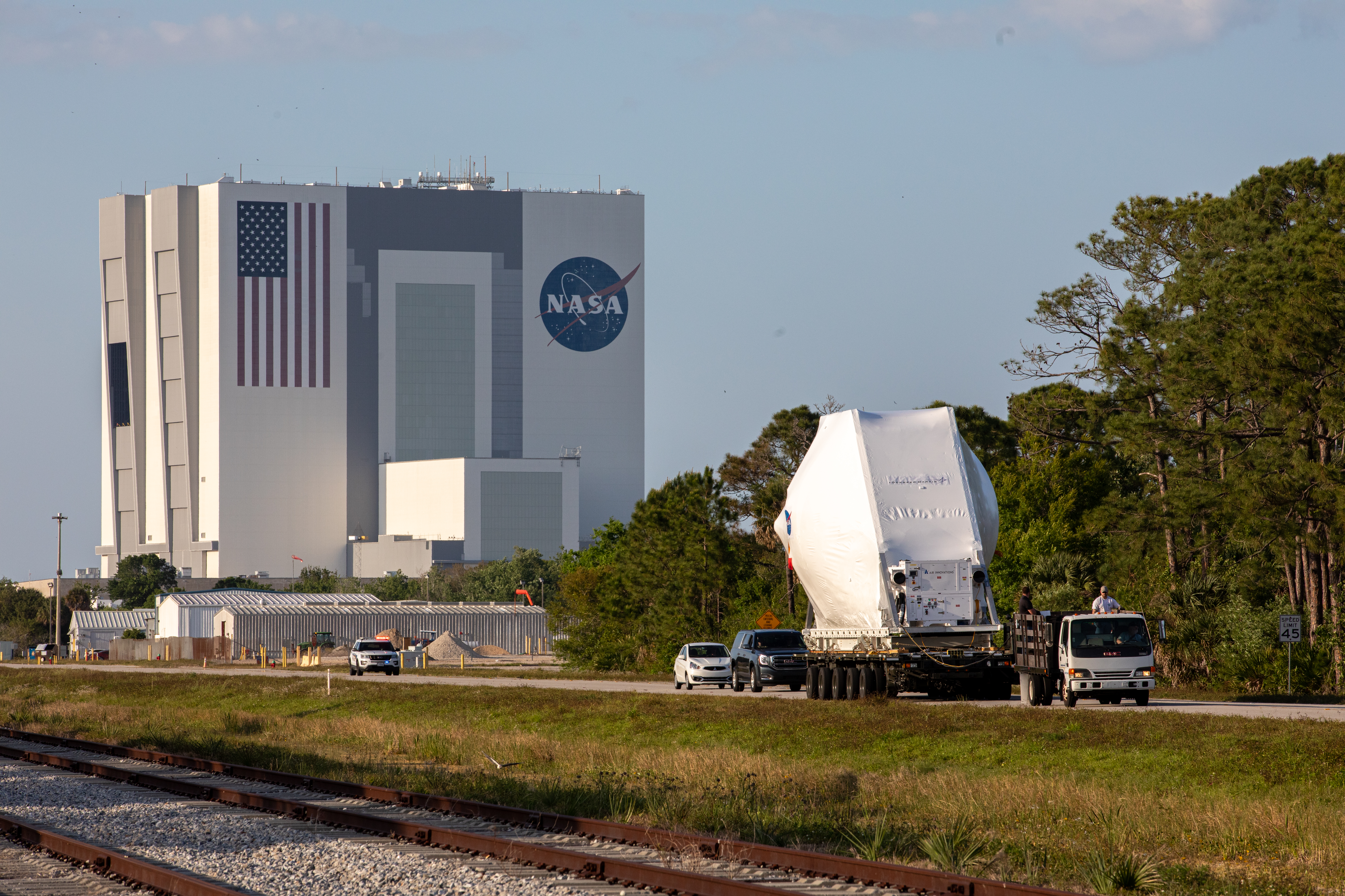 NASA’s Orion spacecraft, protected in its shipping container, is loaded onto a transporter at the Launch and Landing Facility at Kennedy Space Center for its move to the Neil Armstrong Operations and Checkout Building on March 25, 2020. After testing at NASA’s Plum Brook Station in Ohio verified it can handle the extreme conditions of a deep-space environment, the spacecraft – carried by the agency’s Super Guppy aircraft – has returned to the Florida spaceport for final testing and assembly. Following this, Orion will be integrated with the Space Launch System rocket for Artemis I – the first in a series of increasingly complex missions to the Moon that will ultimately lead to the exploration of Mars.