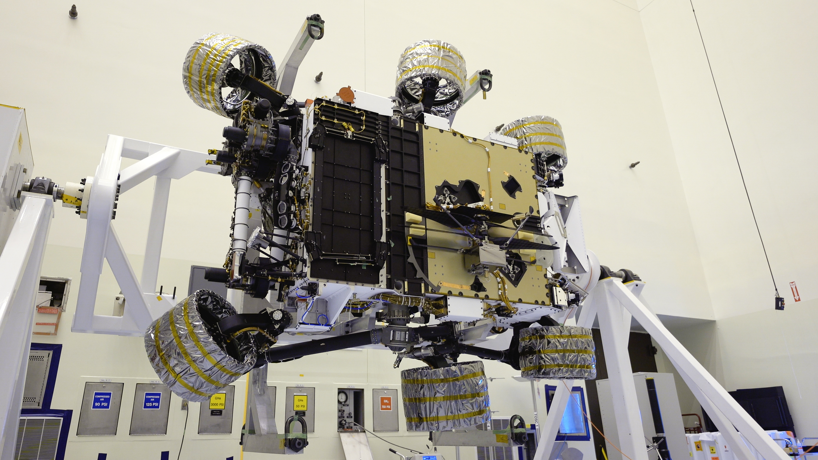 NASA’s Mars Helicopter is installed on the agency’s Mars Perseverance rover inside the Payload Hazardous Servicing Facility at Florida’s Kennedy Space Center on April 6, 2020. Perseverance safely lands on Mars, the helicopter will be released to perform the first in a series of flight tests that will take place during a period of about 30 days. The helicopter will be the first aircraft to fly on another planet. Perseverance, carrying the helicopter, will touch down on the Red Planet on Feb. 18, 2021. Liftoff aboard a United Launch Alliance Atlas V 541 rocket is targeted between July 17 and Aug. 5 from Cape Canaveral Air Force Station.